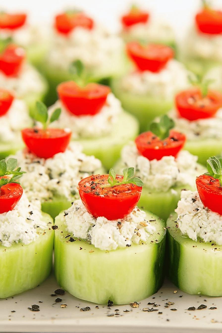 Fatias de pepino crocantes, com recheio cremoso à base de cream cheese misturado com maionese e um toque de molho ranch substituído por iogurte natural temperado. Temperos clássicos como endro, sal de alho e ervas italianas garantem aroma e sabor. Tomatinhos frescos cortados ao meio coroam cada mordida. Ideais para servir em reuniões ou petiscos rápidos, com baixa caloria e preparo ágil.