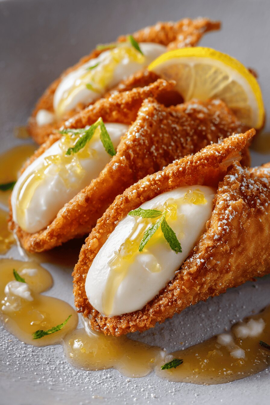 Cannoli crocante recheado com creme de mascarpone e limão siciliano. Massa feita com toque de vinagre de maçã e rum substituindo marsala, para uma sutil acidez e aroma diferente. Frita na temperatura certa, garante casca firme sem queimada. O recheio é adoçado com açúcar demerara, que cria sabor amadeirado e balanceia a acidez do limão. Um doce para quem gosta de textura contrastante e frescor cítrico. Serve 12 unidades, perfeito para reunir a família ou impressionar nos almoços de domingo.