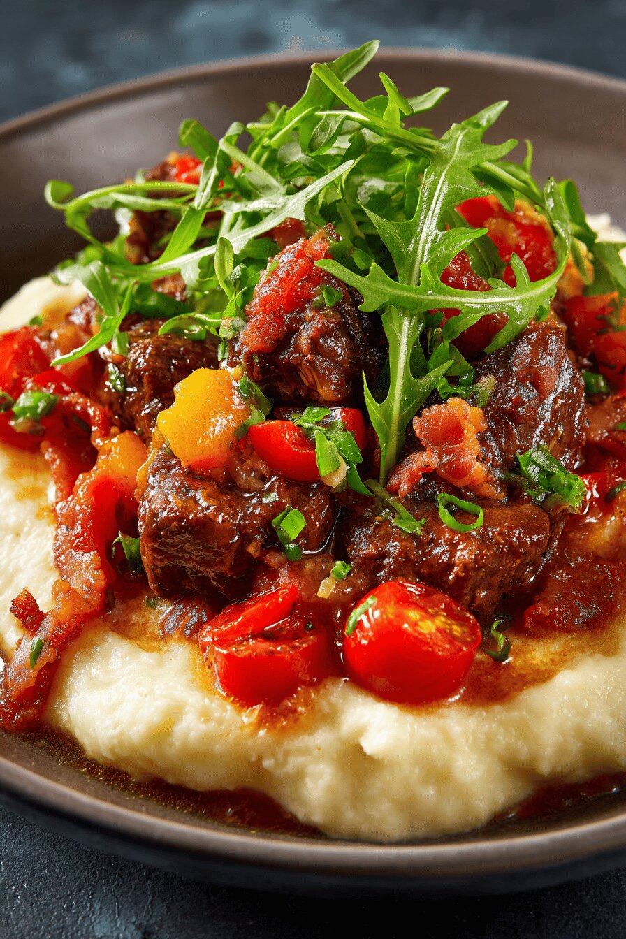 Imagina uma panela soltando aquele cheiro profundo de carne lento cozida, com pimentões coloridos e tomatinhos que estouram na boca, liberando frescor e umido sabor. Muita gente acha que braseado é complicado, mas no fundo é questão de paciência e observação - aguardar a carne amolecer sem perder o caldo rico que se forma no fundo. Eu já tentei mil variações, até que descobri que o lento cozimento aliado a uma boa selagem e o ajuste dos líquidos faz toda a diferença para conseguir pedaços macios, úmidos e com um molho que se agarre na língua. A rúcula, no fim do prato, é o contraponto perfeito para cortar a gordura e trazer crocância fresca. Serve na mesa, esquece de pressa e vem comer sem culpa.