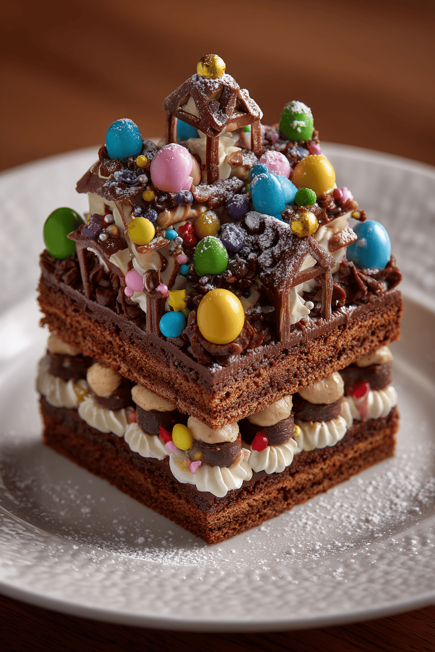 Um bolo em formato de casa, usando camadas de bolo de chocolate com toques de canela e café para esquentar o sabor, cobertura de glacê doce e decoração divertida com balas coloridas e mini biscoitos. Dá para montar uma casinha charmosa que lembra quintal de infância ou aquelas festas de rua, e o visual junto com o doce equilibrado garantem risadas e afetos na mesa.