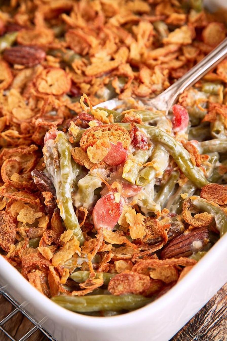 Um prato de forno robusto com vagens verdes envoltas em molho cremoso carregado de linguiça dourada, cogumelos, e queijo derretido. Toque de pimentões para um sabor marcante e cobertura crocante de cebolas fritas e nozes. Perfeito para quem curte comida sulista com personalidade, cheio de texturas contrastantes e aromas fortes que avisam que o tempero está no ponto certo.