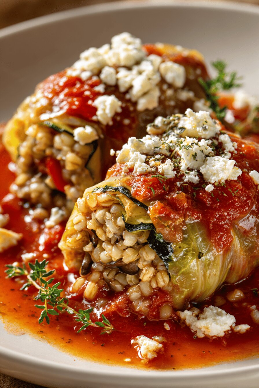 Couve cozida enrolada, mas não na forma tradicional. Aqui ela abraça cevada, diferente do arroz mais comum. Os legumes dão textura e cor. Cogumelos, cebola, pimentão, berinjela, tudo refogado com azeite e vinho branco. O queijo coalho no final, em vez da feta, traz um sabor nordestino. Molho de tomate florido, ideal para cobrir tudo. Cozido devagar, forno baixinho, paciência para couve ficar macia, mas firme. Pode ir com ou sem carne, adaptável. Receita vem da cozinha de casa, mistura simples, tempo longo. Resultado não é só comida, é ideia. Para quem curte juntar legumes, grãos e temperos de maneira diferente. Resistência e sabor. Porção para família ou amigos.