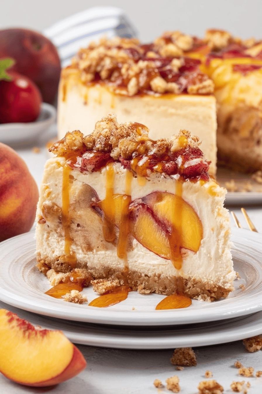 Primeiro, trate os pêssegos com a mistura de açúcar, limão e especiarias com calma para não esfarelar as fatias. Assar em uma única camada melhora a caramelização e evita umidade excessiva. No streusel, evite misturar demais para manter pedaços quebradiços – textura é tudo aqui, o bolo pede contraste. Pressionar a massa bem firme na forma evita que ela se desfaça ao cortar. No preparo do recheio, mesmo que a paciência falte, bata o cream cheese lentamente para evitar grumos e mantenha velocidade baixa ao adicionar ovos para não incorporar ar em excesso. Uso fogo médio, banho-maria e o método de resfriamento gradual para impedir que rachaduras apareçam – já quebrei muitas vezes até aprender isso. Banho-maria assegura uma cozimento uniforme e cremoso. Finalização com os extras na hora de servir mantém frescor e crocância. Fatiar com faca aquecida é truque antigo que nunca falha.