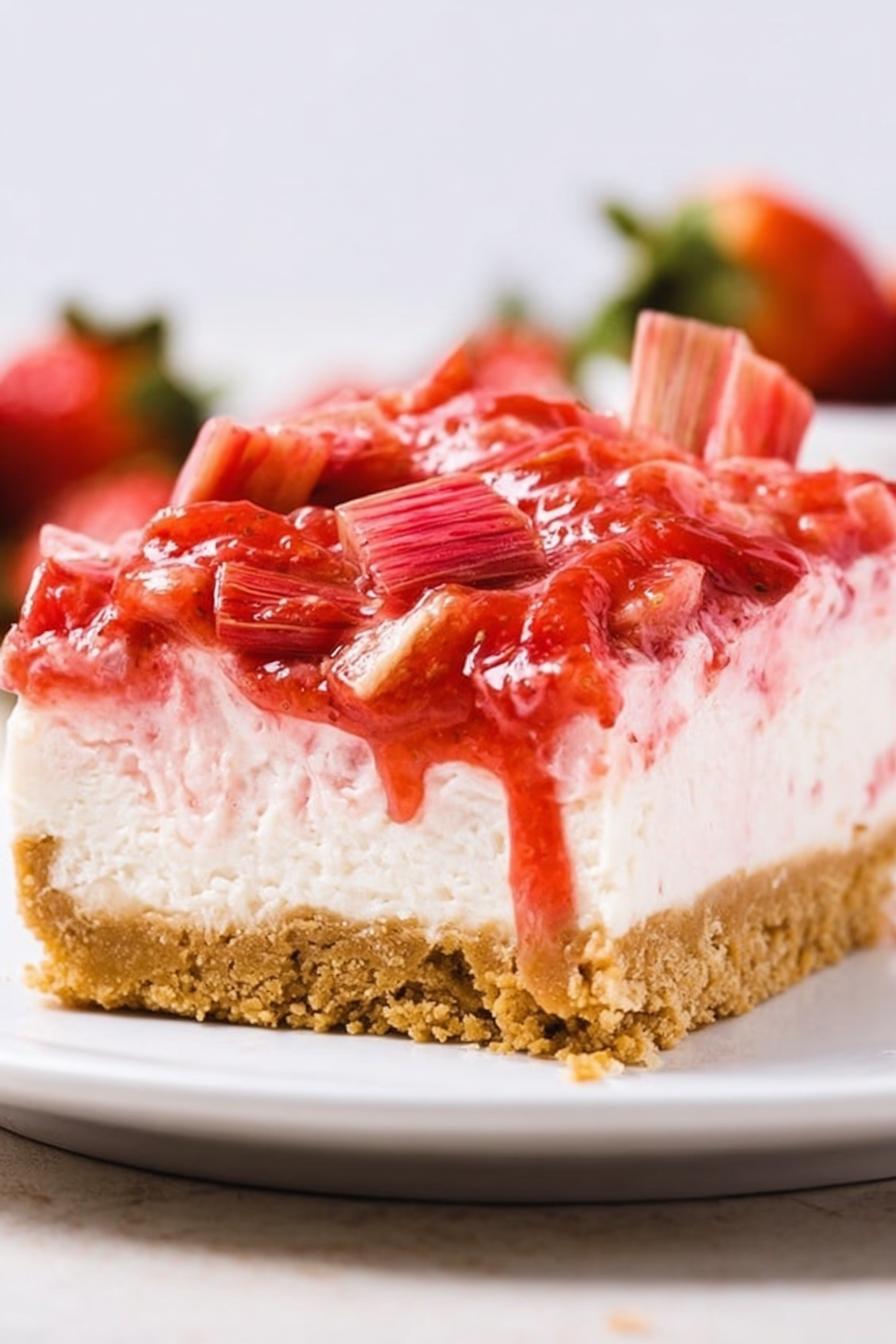 Camada base crocante de biscoito estilo graham cracker com toque de manteiga, cobertura cremosa de cream cheese e chantilly, finalizada com calda quente de morangos e ruibarbo que engrossa lentamente no fogo. Um equilíbrio entre o azedinho do ruibarbo e o doce vibrante do morango, ideal para quem já testou várias versões e quer algo que funciona de verdade. A textura firme e molhadinha da cobertura com o contraste da crosta que segura tudo. Uma receita onde o tempo de resfriamento é crucial e o sabor do limão traz frescor na medida certa.