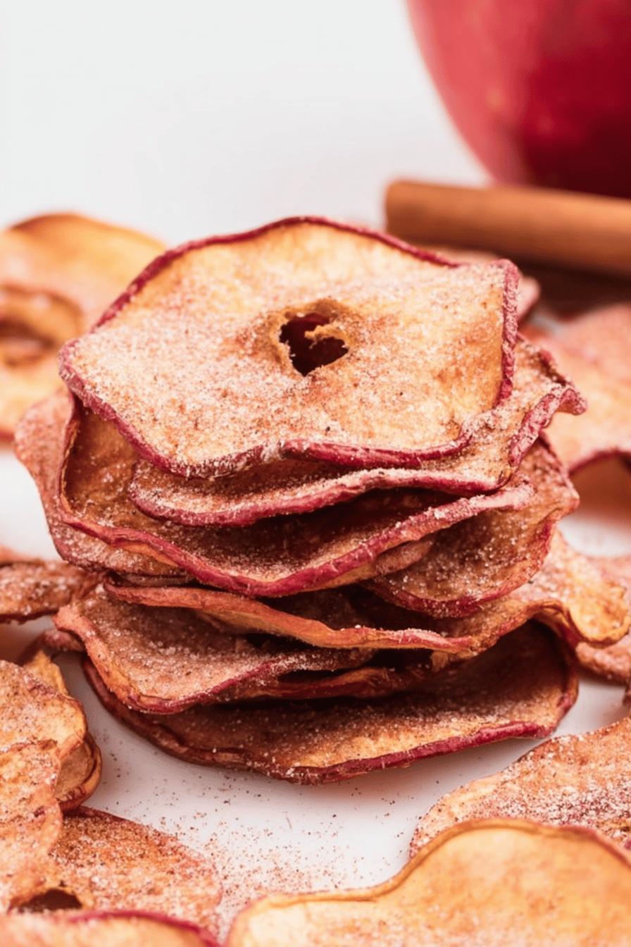 Fatias finas de maçã assadas lentamente para ficar crocantes. Polvilhadas com açúcar mascavo e canela, com um toque de baunilha para um sabor diferente. Sem peelings desnecessários, mantém parte da casca para textura e nutrientes. Leves, crocantes e levemente douradas, ótimas para um lanche ou adicionar em iogurtes e saladas.