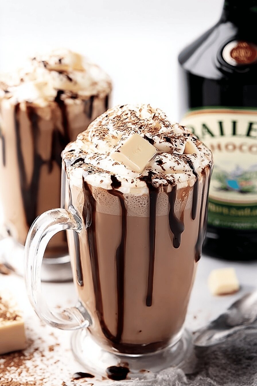 Um chocolate quente cremoso com um toque alcoólico feito com creme irlandês Baileys, usando leite integral aquecido no micro-ondas e cacau intenso. A doçura equilibrada pela riqueza do Baileys, detalhes na textura, e aroma que envolve a cozinha. Serve para um momento aconchegante, rapidinho, com opção de chantilly e raspas para enfeitar.