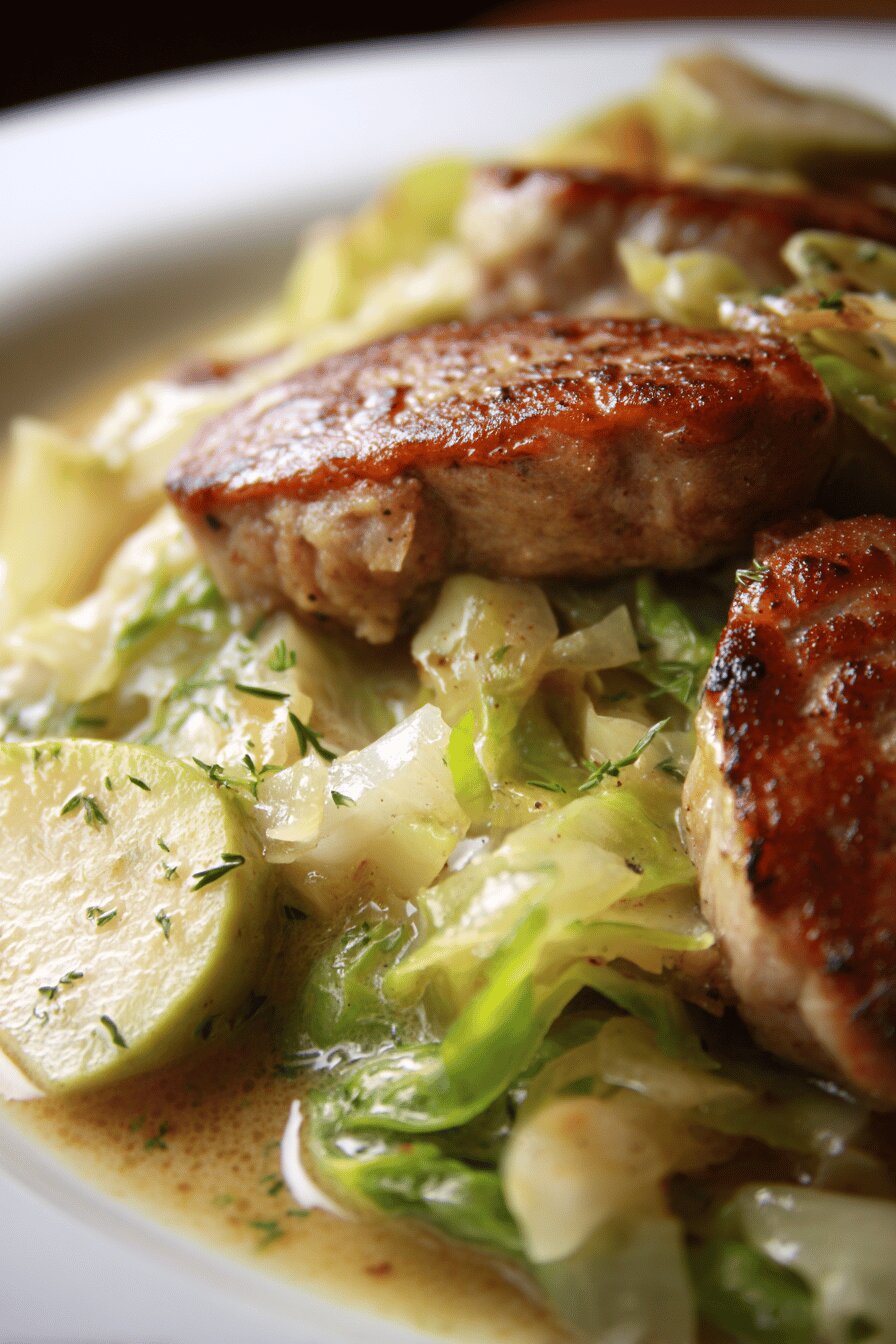 Prato principal que mistura carne de porco com repolho refogado e cerveja clara. Salsicha polonesa, costeletas suínas douradas e maçãs dão sabor. Cozinha lenta para carne ficar macia, com toque de alho, cebola e cravo. Redução do molho final concentra o sabor, acompanhamento simples, como mostarda, pode ser servido. Sem ingredientes com glúten, lactose, ovos ou nozes. Versão adaptada com quantidades e ingredientes variados para perfil brasileiro, com passo a passo reorganizado e tempos ajustados.