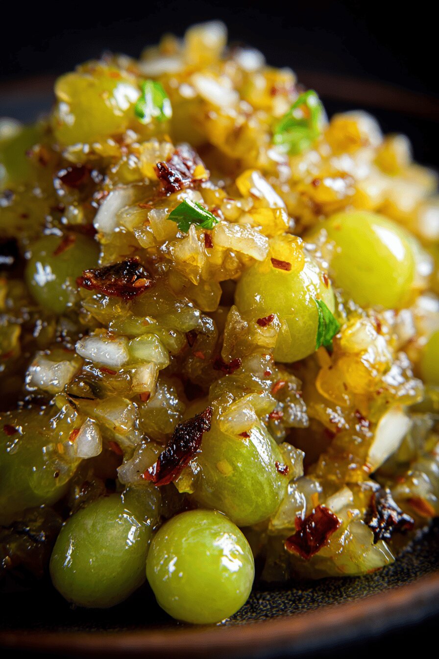 Chutney vibrante, mistura uvas verdes cortadas ao meio, passas douradas pra um toque doce, gengibre cristalizado em cubinhos trazendo picância e textura. Vinagre de maçã substitui balsâmico, um caldo semi-rústico perfumado com um toque de canela e pimenta calabresa em vez de cayenne. Fecula de araruta vence a de milho, engrossando com suavidade. A mistura cozinha até virar compota espessa, com aroma que inunda a cozinha, maciez certeira nas uvas murchas, perfeito para queijos, paes artesanais e até grelhados.