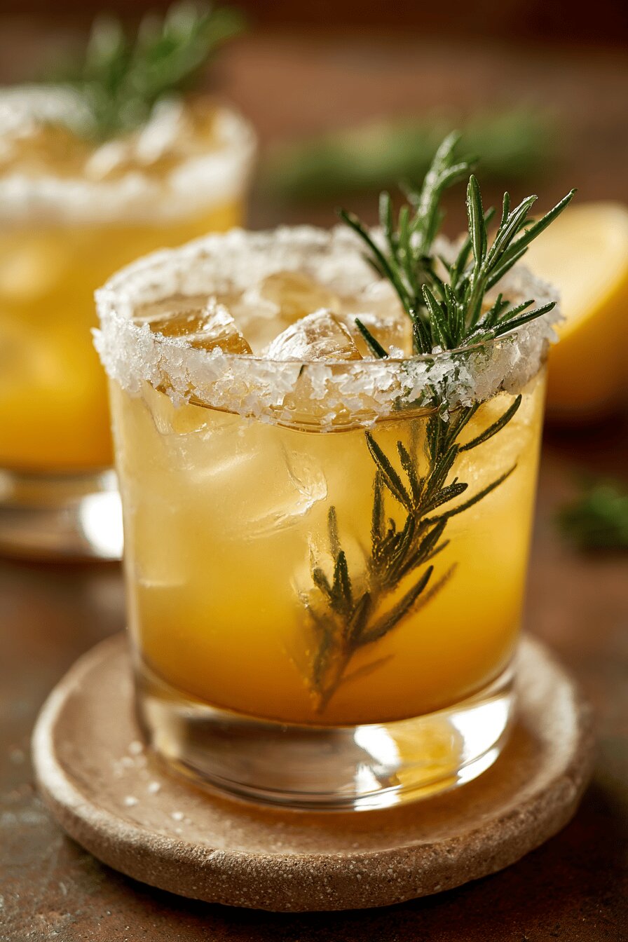 - Pressione a borda do copo na mistura de açúcar com alecrim para criar uma crosta aromática. Reserve.