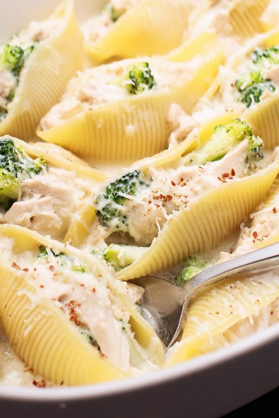 Escolha massas tipo conchas porque seguram o recheio, se não usar aquelas comuns tipo penne ou fusilli, o molho pode escorrer tudo e perder a graça. Para o molho Alfredo, um pote industrializado ajuda quando o tempo é curto, mas um casa funciona bem com creme de leite, manteiga e queijo parmesão. Queijo parmesão deve ser ralado na hora pra gerar aquele aroma intenso, mussarela preferencialmente fresca ou ralada prensada. Frango cozido pode ser feito no dia ou sobras, desfiar é mais rápido com garfo, mas cuidado pra não ficar muito pequeno e sumir dentro da concha. Brócolis deve estar cozido no vapor, evitar cozinhar demais pra não perder a cor ou ficar mole demais – o contraste é o que dá vida ao prato. Pode trocar o frango por peru, carne moída bem temperada, ou até cogumelos salteados pros vegetarianos. A pimenta-do-reino é essencial pra trazer frescor, use moída na hora, não a de saquinho. Algumas pessoas gostam de adicionar noz-moscada no molho Alfredo pra dar uma profundidade, é opcional, mas coisa pequena, não exagere. O azeite na travessa não é obrigatório, mas evita surpresas na hora de servir e facilita limpeza posterior.