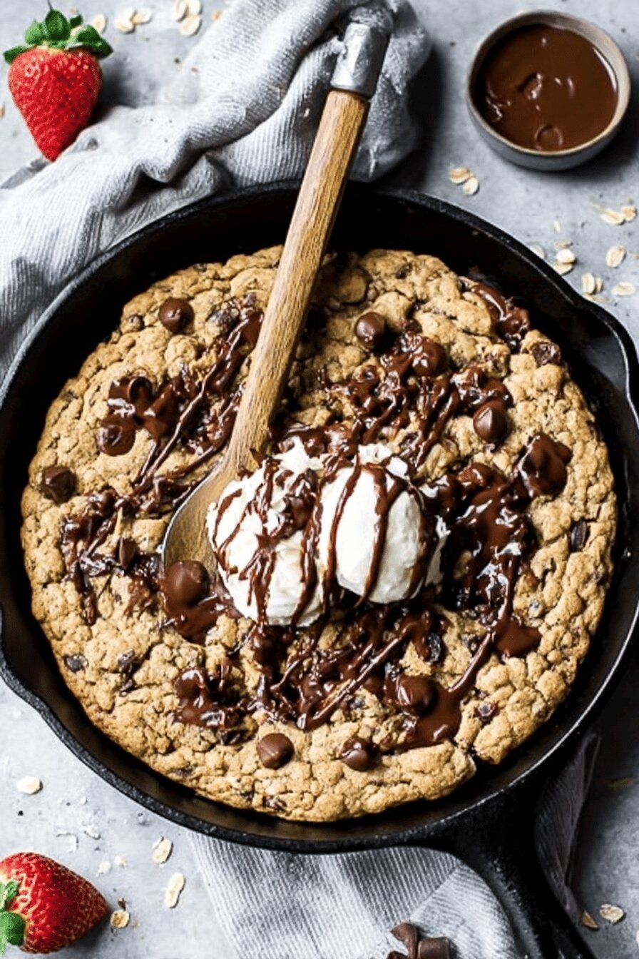 Cookie gigante assado na frigideira de ferro, mistura de aveia, frutas secas substituindo passas por damasco e gotas de chocolate meio amargo. Massa amanteigada com especiarias que deixam aroma incrível, textura levemente crocante fora e macia por dentro. O uso de fermento e especiarias ajustado para sabor equilibrado, tempos de forno ligeiramente alterados para assar perfeitamente sem queimar. Uma receita versátil, gostosa e prática, que revela os ingreientes com diferenças sutis e funcionais, ideal pra quem não quer gastar tempo nem sujar muito louça.