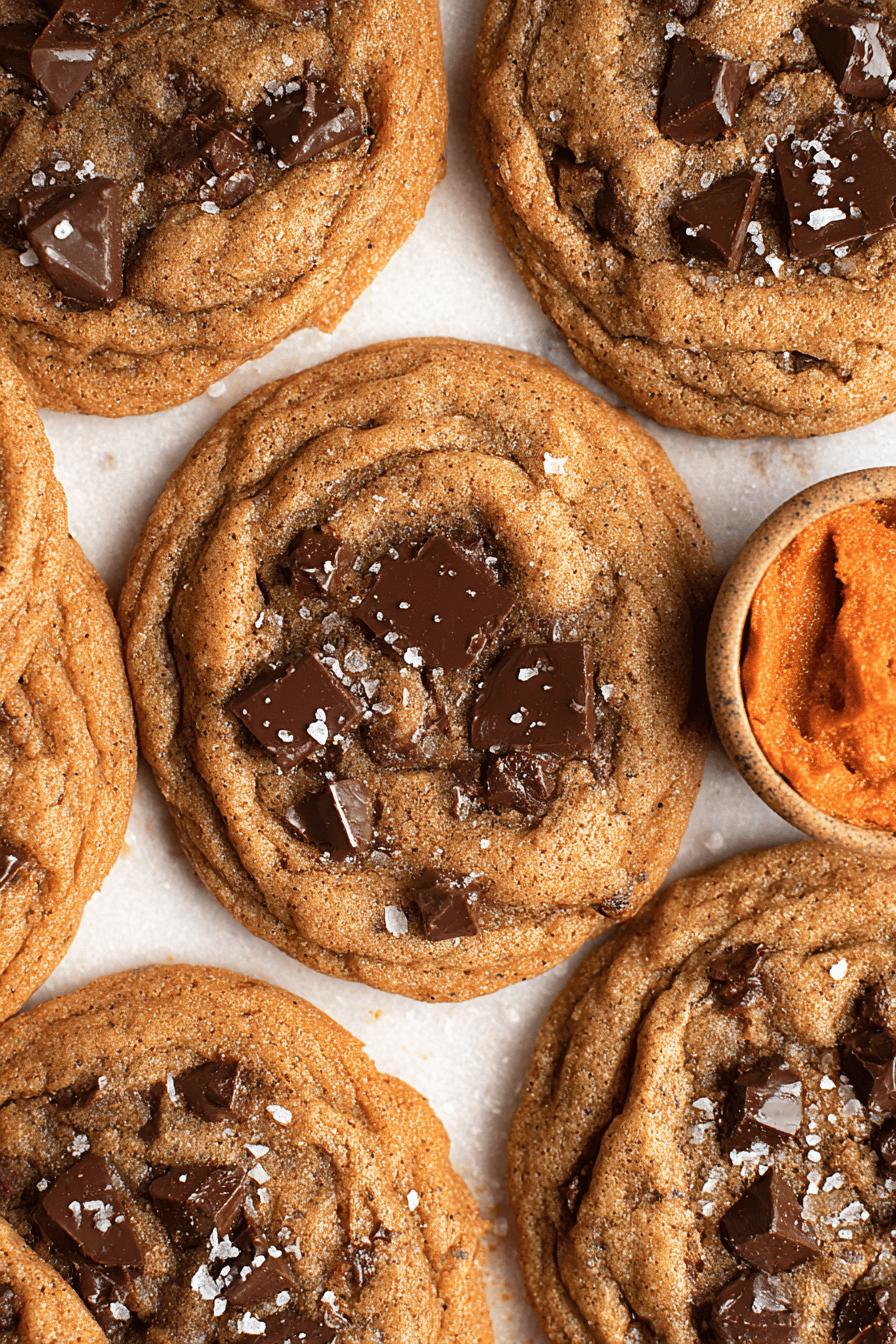 Cookies com abóbora e pedaços de chocolate ao leite, usando manteiga dourada para aroma profundo. Açúcar mascavo levemente ajustado, farinha integral no lugar da branca, e toque especial com canela. Massa deixada hidratar, garantindo maciez. Chocolate extra para cobertura, finalizados com pitadas de sal grosso. Cozimento atento ao toque e visual para textura suave e bordas firmes. Versão adaptada para evitar massa seca e equilibrar sabor outonal.