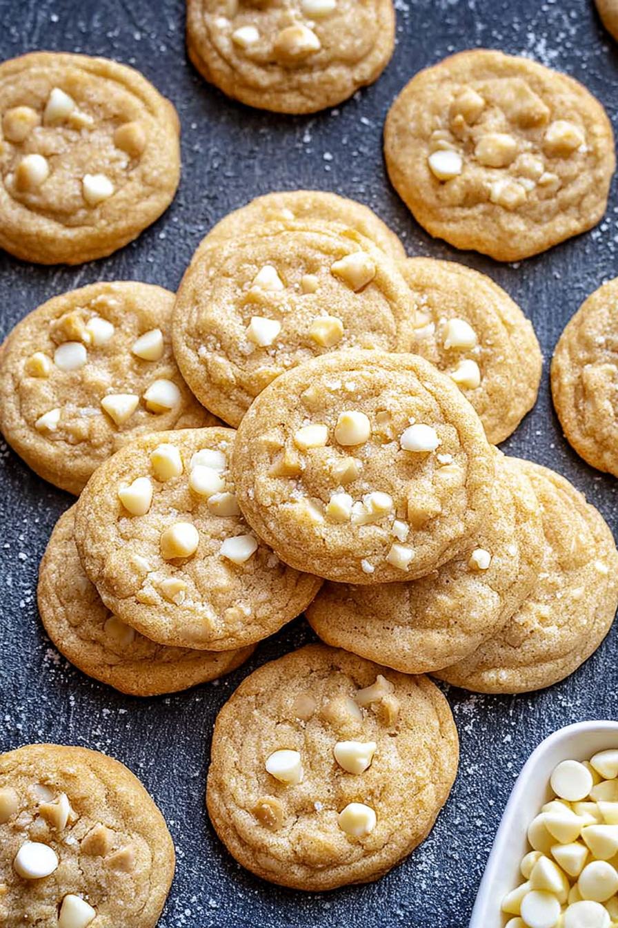 Massa custosa que firma mais, sem excesso de açúcar. Troque 100g do chocolate branco por creme de leite fresco – um toque molhadinho. Farinha, fermento, amido e sal misturados com sovadas precisas para manter leveza. Chocolate derretido com manteiga para textura aveludada, cuidado para não separar. Bater ovos e açúcares até esbranquiçado, acrescentar mistura derretida com calma. Macadâmias moídas grosseiramente, crocantes. Massa gelada, pra não espalhar demais. Sal marinho final, equilibra o doce. Assa em assadeira forrada, entre 11 e 13 minutos. Cookies incham e firmam ao esfriar, sinal pra tirar. Toque gourmet, não só doce, é contraste. Aroma doce, manteiga cremosa, textura densa com pedacinhos crocantes.