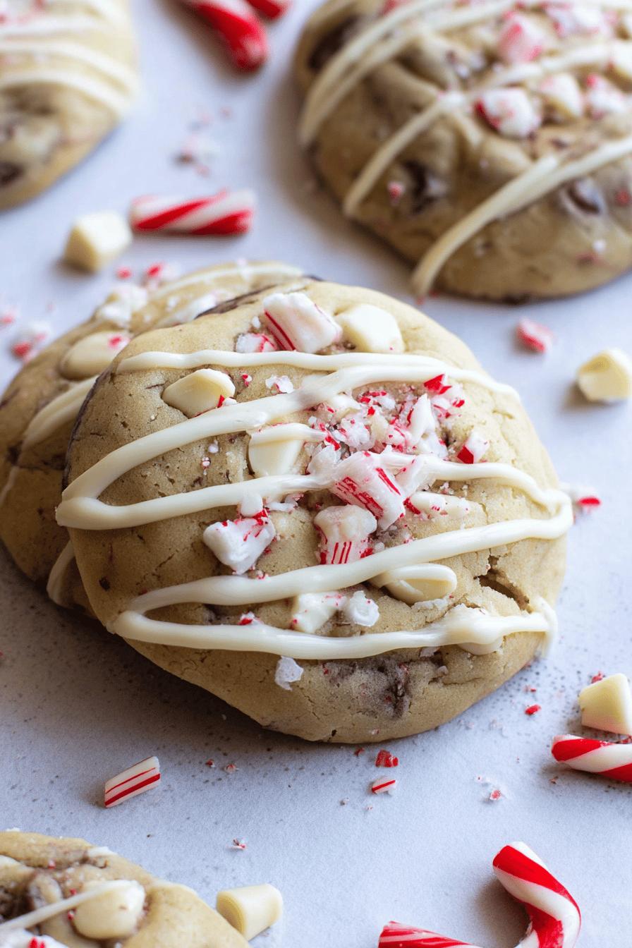 Biscoitos com mistura de farinhas que traz textura leve, acrescidos de pedaços crocantes de chocolate branco e bastões de menta moída. A combinação entre o doce do chocolate e o frescor da menta cria contraste interessante, enquanto o toque de baunilha e as gemas garantem úmido e maciez. Uso creme de manteiga batida para incorporar ar e garantir leveza. Cozimento rápido, deixando bordas firmes e centro ainda macio; o rebuliço do chocolate branco derretido é visível na superfície. Finalizados com calda de chocolate branco e confeitos de menta, atraem visual e aroma peculiar do final de ano com um twist que já adaptei ao paladar mais rústico do Brasil.