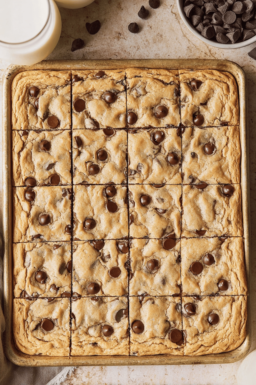 Cookies macios e úmidos com gotas de chocolate, preparados direto em uma assadeira média. Batedura feita com manteiga derretida, açúcar refinado e mascavo, ovos frescos e toque de leite para garantir textura cremosa. Farinha, fermento e sal na medida certa para estrutura ideal. Chocolate meio amargo garantido, com opção de adicionar no topo pós-forno para visual melado. Assados em temperatura média-baixa para cozimento homogêneo, retirados ainda ligeiramente moles, para firmeza durante o resfriamento. Rende cerca de 24 quadrados, fácil para servir em porções práticas. Doce simples, ideal para lanches ou café da tarde, um clássico fácil com toque caseiro que agrada qualquer crowd.