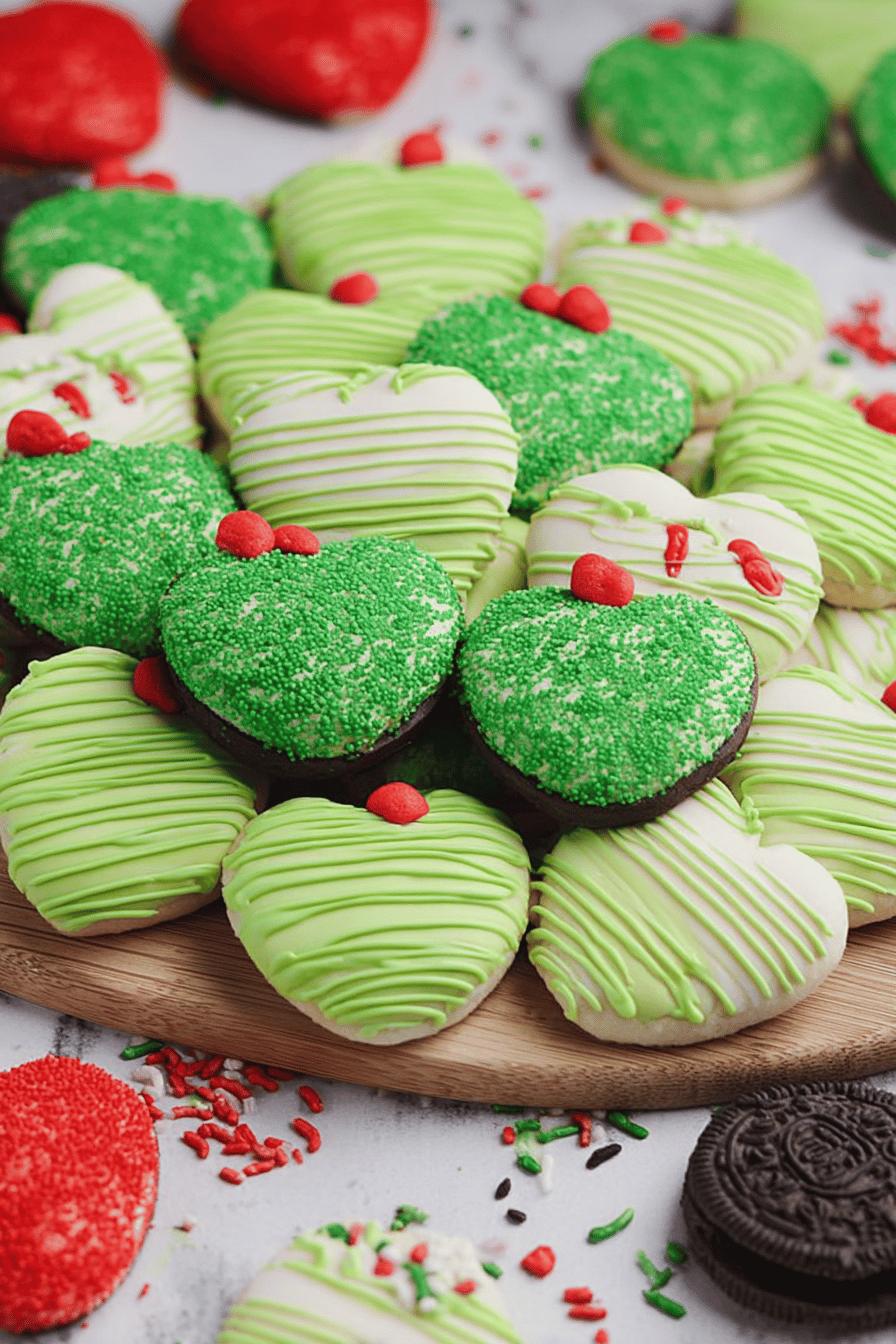 Bolachas Oreo mergulhadas em chocolate verde com toque natalino, decoradas com açúcar colorido e detalhes vermelhos para imitar o Grinch. Uso chocolate branco tingido para o efeito das cores, com alternativa de chocolate ao leite. Técnicas de banho-maria para derreter chocolate e dicas para evitar excesso nos cookies. Preparação rápida, ideal para festa de Natal ou reunião. Receita adaptada para garantir crocância da bolacha sem amolecer demais com o chocolate.