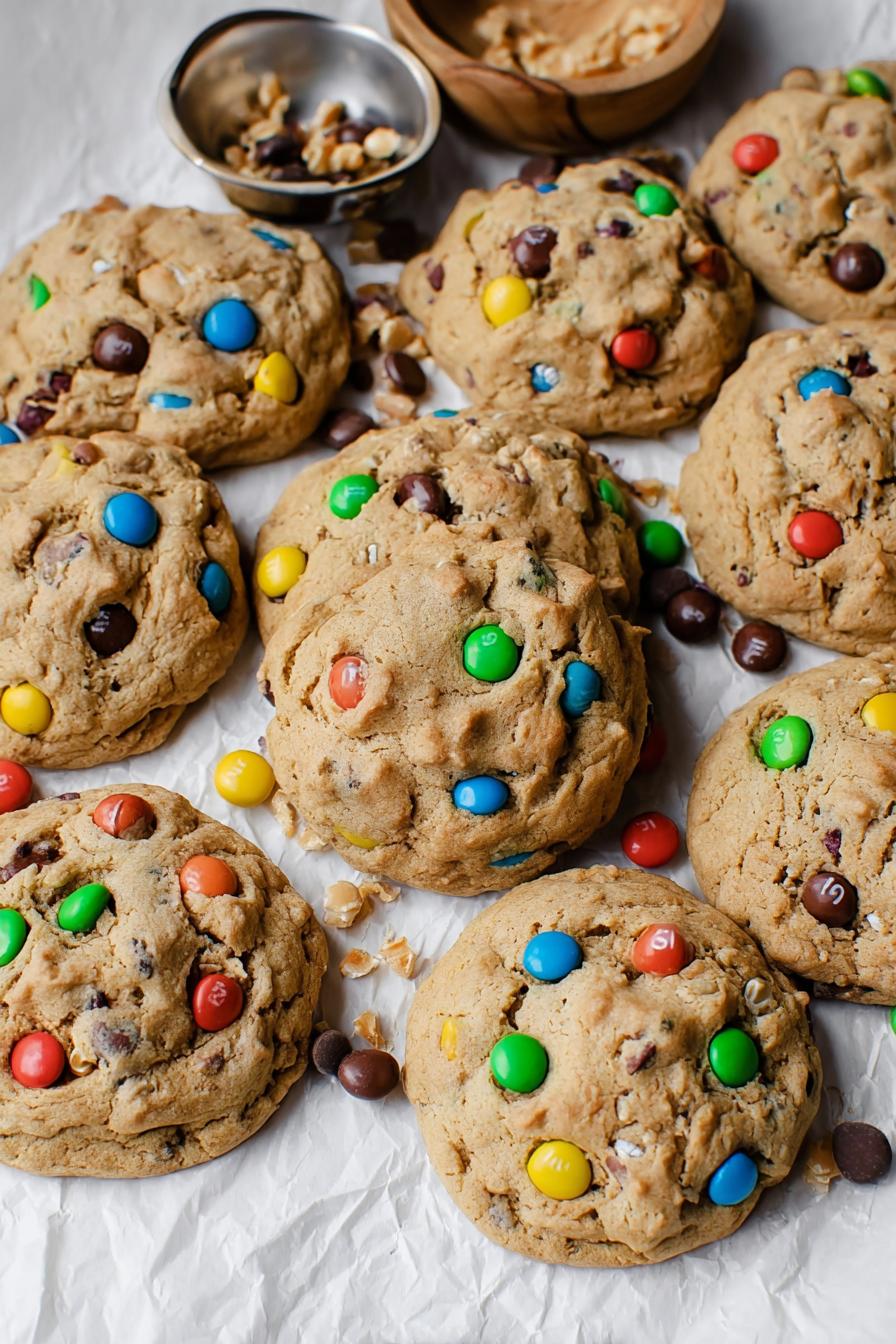 Biscoitos grandes com textura densa, mistura de farinhas e crocância dos amendoins picados. Combina M&Ms, gotas de chocolate e aveia para contraste. Usa farinha de trigo e cake flour com amido para equilíbrio entre leveza e firmeza. O toque do sal grosso realça o sabor e cria um contraste incrível. Receita adaptada para tempo e sabor, com técnica para não ressecar e dicas para substituir ingredientes comuns. Ideal para quem gosta de um cookie carregado, intenso, com várias texturas e aquele aroma irresistível de manteiga de amendoim e baunilha.