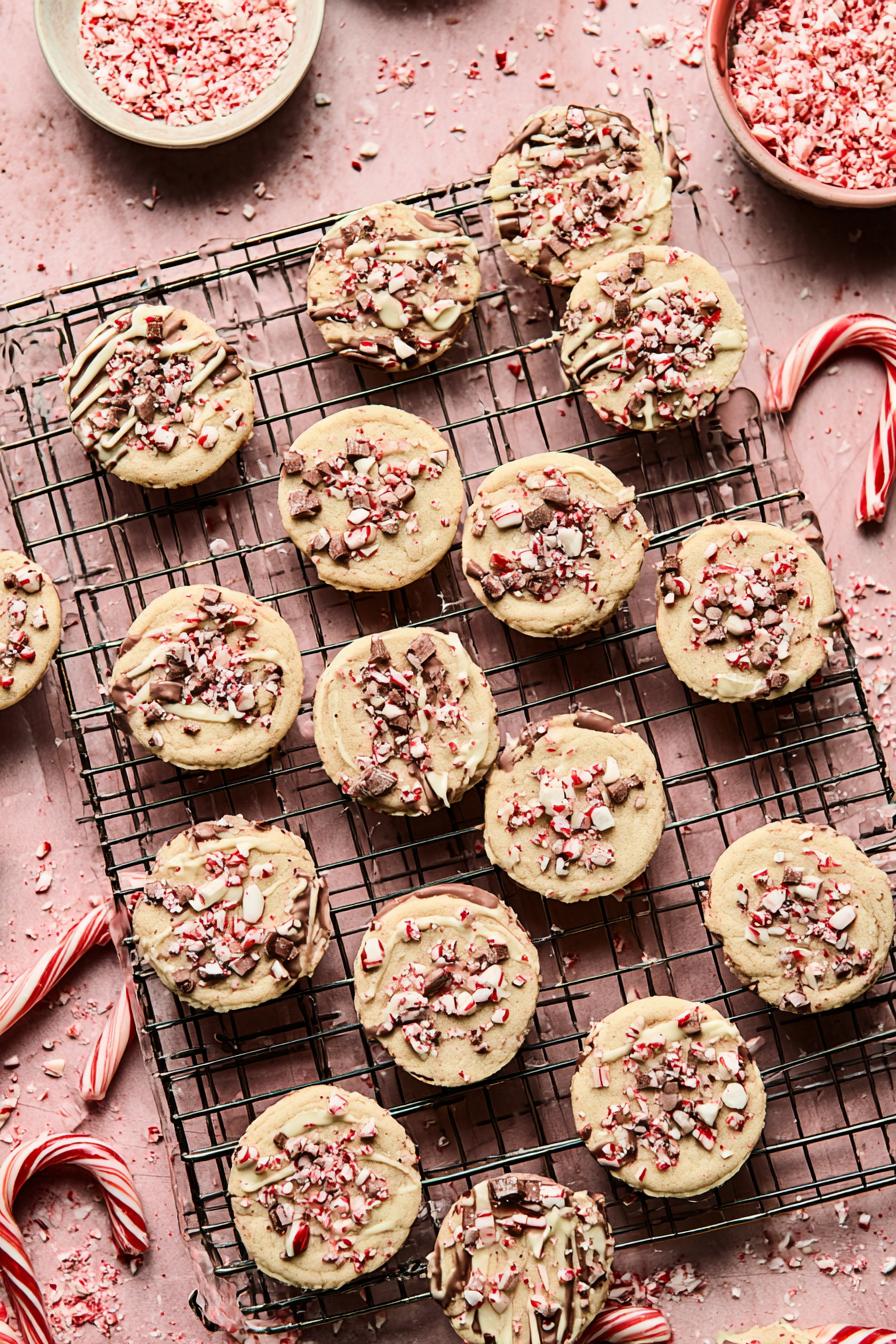Biscoitos com sabor de chocolate intenso e toque de hortelã, cobertos com buttercream branco e pedaços de peppermint bark. A massa combina cacau, café em pó e um leve crocante do amido de milho, garantindo textura aveludada. O recheio traz uma mistura rica de manteiga batida com chocolate branco derretido e gengibre como toque surpresa, contrastando com a doçura e frescor das balas de menta. Indicados para ocasiões especiais em que um docinho fora do comum faz diferença.