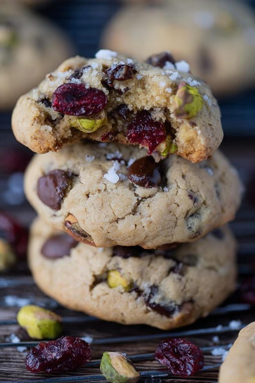Biscoitos crocantes com pistache e cranberry. Mistura manteiga batida com açúcar, um toque de farinha de aveia em vez de farinha branca, e uma pitada de canela pra dar complexidade. Passa por processo de mistura até quase formar uma massa, com ingredientes secos e úmidos separados, finalizando com pistaches picados, cranberry seca e raspas de limão. Assa até dourar nas bordas, resultado crocante por fora e levemente macio dentro. Troca a farinha tradicional por aveia em flocos finos, substitui açúcar mascavo por açúcar de coco, da um toque aromático e saúde.