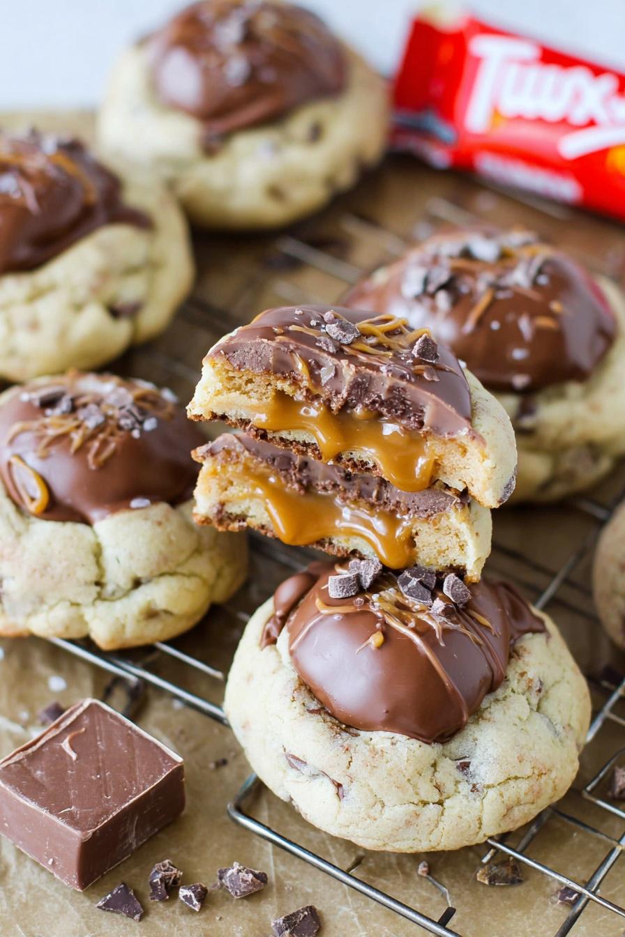 Cookies com pedaços de Twix congelados incorporados na massa, cobertos por uma camada generosa de caramelo caseiro feito com leite condensado e uma finalização crocante de chocolate meio amargo com pitada de flor de sal. Massa enriquecida com farinha de trigo integral para textura mais firme e sabor rústico. Sugestões de substituição incluem manteiga sem sal e trocas dos pedaços de Twix por outras barras crocantes. Tempo de forno ajustado para observação da cor e firmeza das bordas. Receita indicada para quem gosta de experimentar camadas de textura e sabor em cookies grandes e macios, mas que não desgrudem.