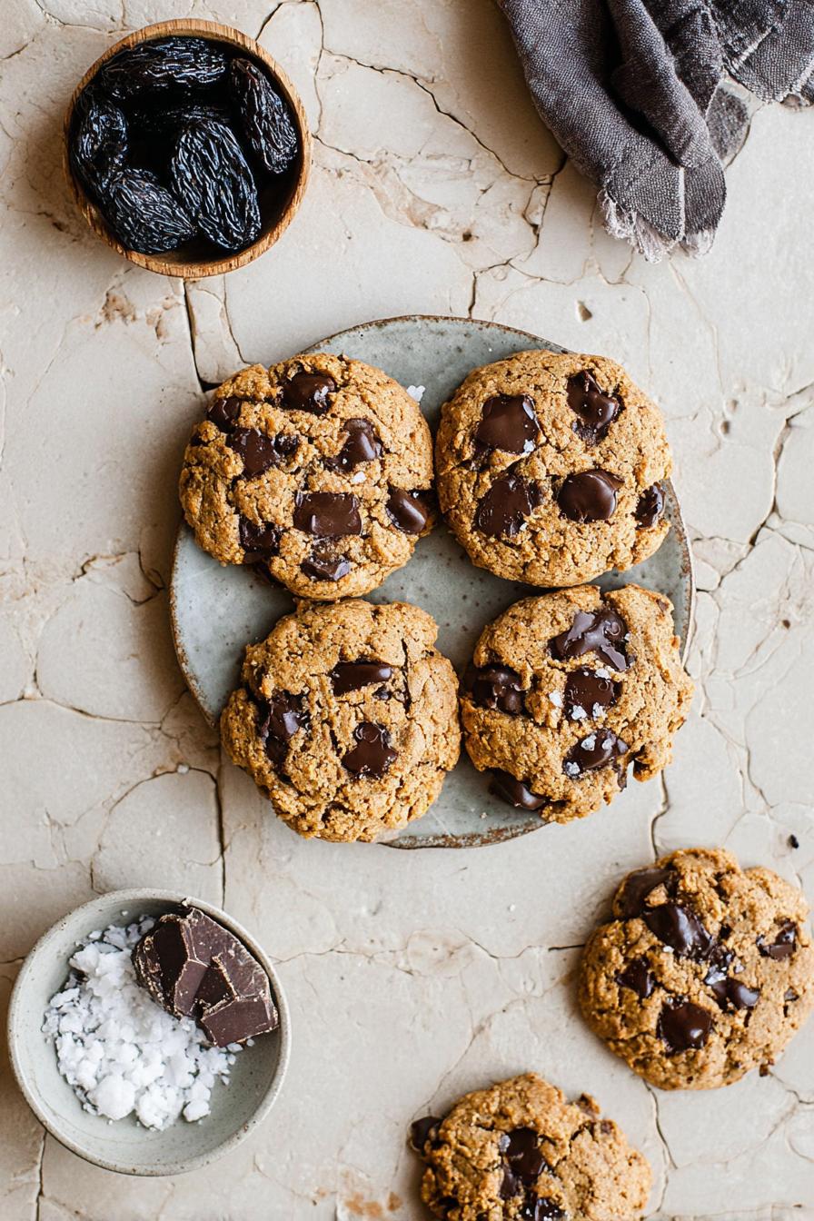 Cookies veganos usando purê de ameixa em lugar do ovo tradicional, combinando farinhas diversas, uma pitada de café para intensificar sabores e chocolates veganos. Com textura macia por dentro, crocância leve nas bordas e um toque salgado no final, esses cookies são resultado de muita tentativa e erro, e ajuste no tempo para evitar que fiquem muito secos ou crus. Serve 12, com preparo rápido, aproveitando o que a cozinha tem de melhor para adoçar sem exageros e manter tudo vegano.
