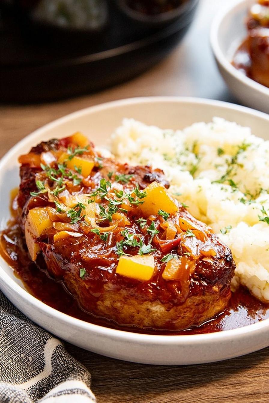 Costeletas suculentas cozidas devagar com temperos secos e molho barbecue. Preparação que usa um mix de ervas e especiarias feito em casa com toque especial no líquido, substituindo água ou caldo por cerveja preta para um sabor mais encorpado. Cozimento lento que preserva a maciez, finalização no forno para caramelizar o molho e adicionar bacon crocante, queijo derretido e salsinha fresca. Acompanhado de purê e legumes, prato com aroma intenso e textura equilibrada que evita o erro comum de transformar costeletas em carne desfiada demais.