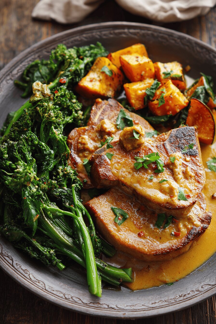 Côtelettes suínas cozidas com toque doce do xarope de bordo e sabor sutil do curry. Acompanhadas de abóboras torradas e sautée de brócolis-rápinis, formando prato reconfortante. Sem glúten, lactose, ovos e oleaginosas. Textura macia do porco, contraste crocante e vegetal. Técnica de dourar carne antes, conservar suculência. Calor do forno para abóboras até dourar, adição rápida dos rápunis dá frescor e cor vibrante. Molho encorpado que envolve, garante mordida adocicada equilibrada. Substituir abóbora por abóbora cabotiá ou moranga. Caldo de cogumelos substitui caldo de carne para versão vegetariana com tofu firme. Ideal para quem gosta de pratos aromáticos e convidativos.