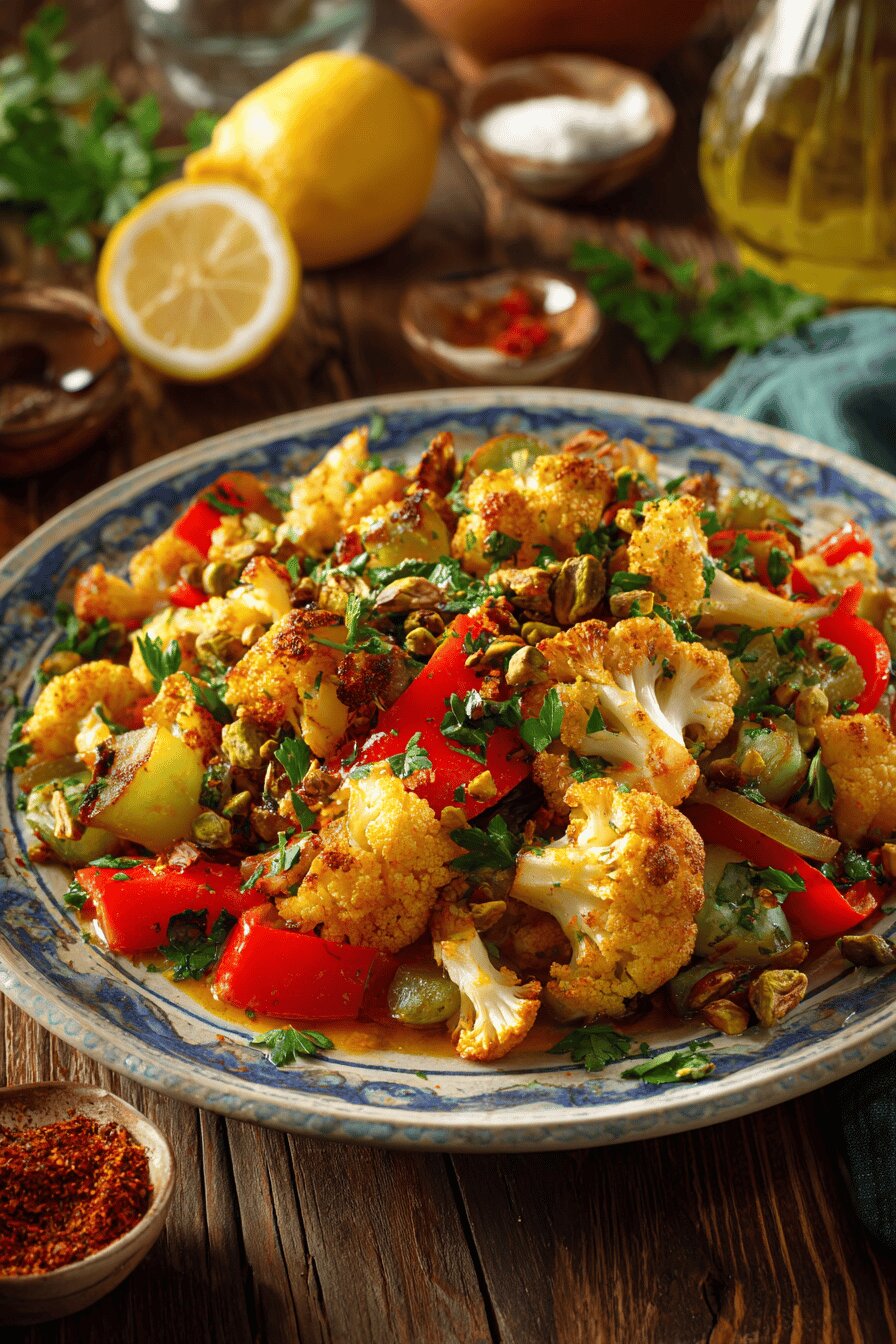 Versão fusion do couscous tradicional usando couve-flor raladinha como base. Um prato vegetariano, leve, sem lactose, ovos e glúten, que mistura a crocância das amêndoas tostadas à doçura dos damascos e abacaxi em cubos. Um toque de gengibre fresco substitui a corriandra, trazendo frescor e uma pitada exótica; o toque ácido vem do suco de limão siciliano. O cozimento é feito com atenção ao ponto al dente da couve-flor para manter textura e sabor. Prato versátil, serve de base para acompanhamentos e entrée vegetariana.