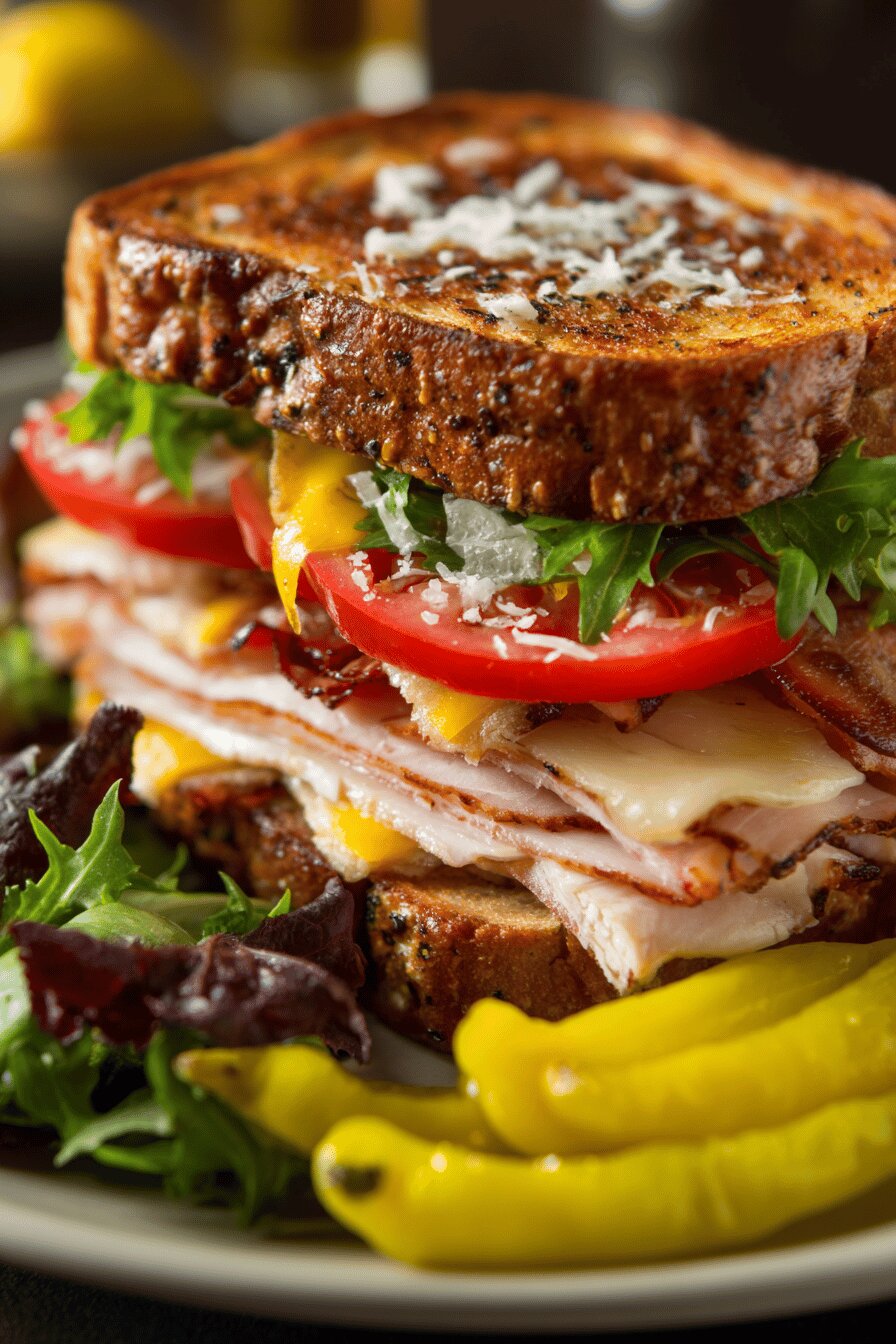 Sanduíche grelhado diferente. Um pão amanteigado, camadas alternadas de carnes defumadas e queijo que derrete. Tomate temperado com pimenta, toque de picles. Assar até queijo correr. Variação com peito de peru e queijo gruyère, troca bacon por presunto curado italiano e picles de pepino por picles de cebola. Fácil, rápido, crocante e suculento. 1 porção, forno médio, 20 minutos de cozimento. Serve no almoço ou lanche.