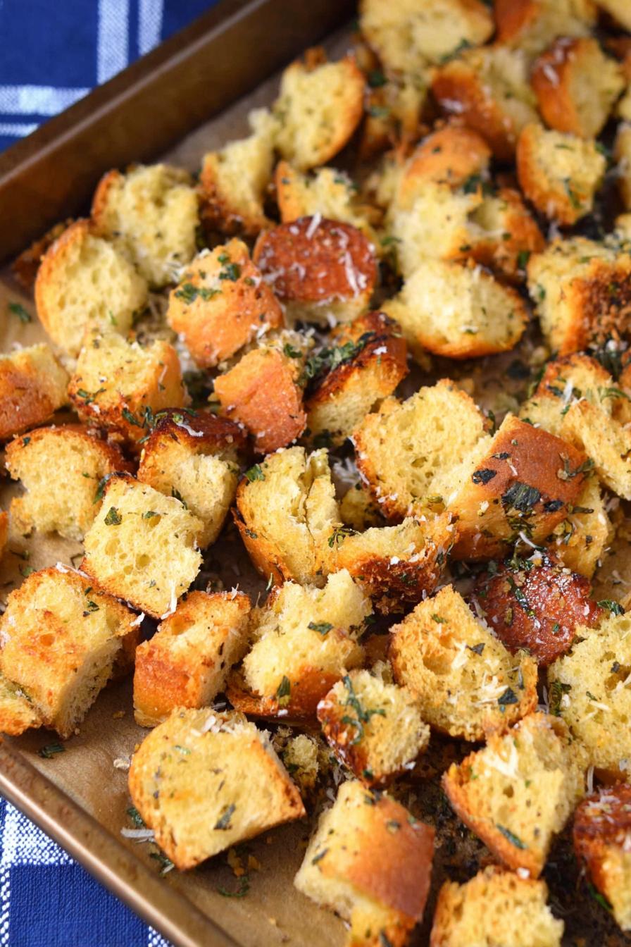 Cubinhos de pão de cachorro-quente torrados no forno, temperados com alho, sal, salsa e pimenta. Variante com azeite e tomilho fresco, crocância na medida certa, textura perfeita pra salada ou sopa. Ajuste feito nas quantidades e tempos pra dourar no ponto, sem queimar. Dica: substitua salsa seca por orégano pra um toque diferente. Uso pão tipo baguete, pode usar para aproveitar sobras e evitar desperdício.