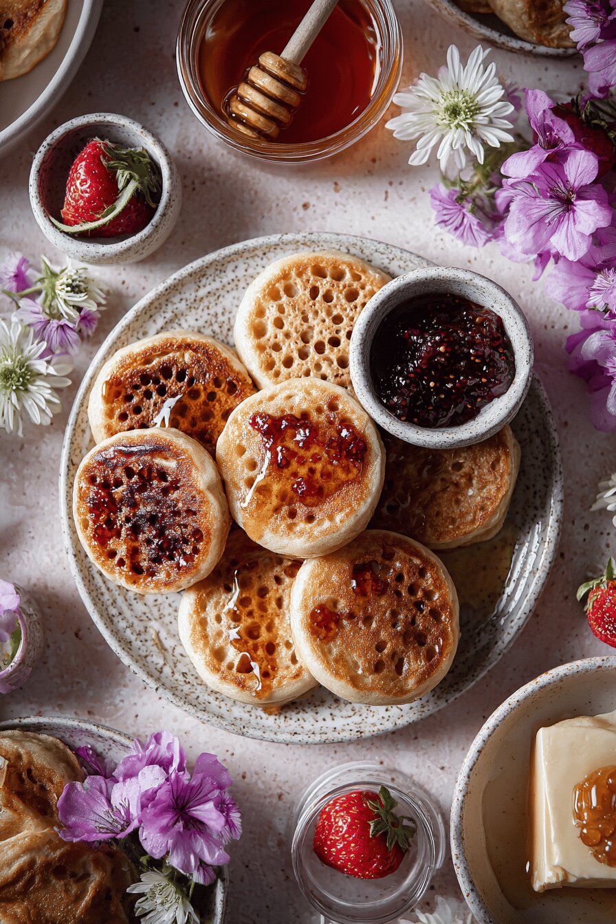 Crumpets com farinha de trigo branca e integral, fermentados com levedura instantânea e fermento natural de laranja, textura aerada com buracos característicos. Receita adaptada da tradicional francesa, trocando leite de manteiga por kefir para acidez mais suave. Cozidos em formas metálicas untadas com azeite, douram mantendo maciez interna. Receita vegetariana, sem ovos nem oleaginosas, ideal para café da manhã ou lanche com geleia ou mel. Resultado com aroma cítrico, leve efervescência local devido ao bicarbonato ativado pelo ácido do kefir. Tempo somado para fermentações controladas entre 1h15 e 1h40, toque artesanal com sugestões de variações essenciais para iniciantes e desafiantes na cozinha.