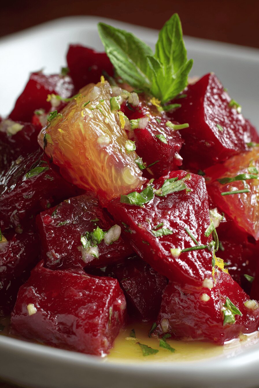 Beterrabas cozidas até ficarem macias, cortadas em cubos generosos, salteadas devagar com alho poró e manteiga de coco. Um toque cítrico vem da redução do suco e raspas da laranja, que equilibra a doçura terrosa da raiz. As ervas frescas finalizam com aromas convidativos, criando um prato colorido e sem glúten, sem lactose e vegetariano, que anda bem em qualquer estação ou refeição leve.