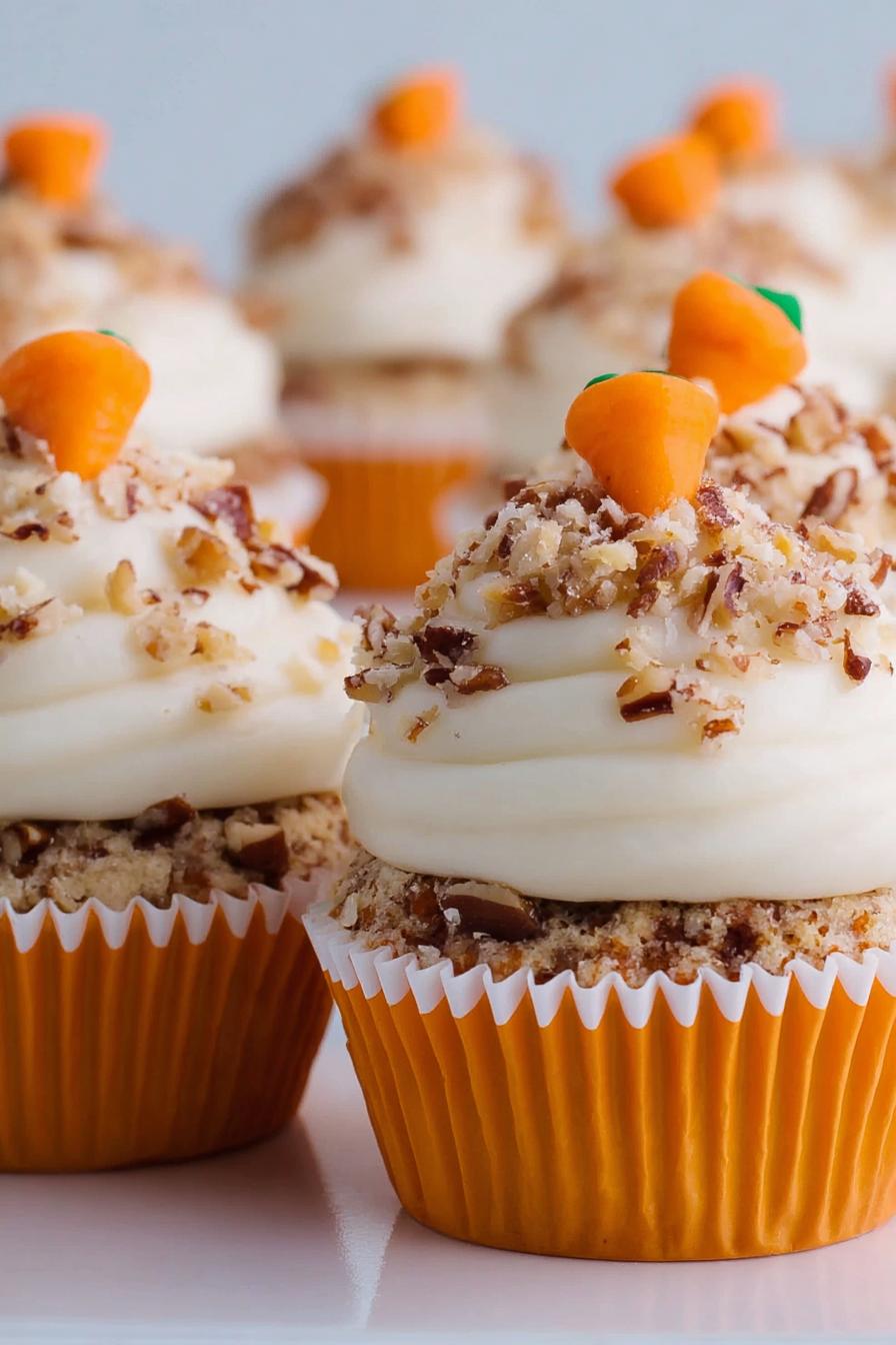 Cupcake de cenoura com textura úmida, aromatizado com canela e noz-moscada, coberto por um creme de cream cheese batido até ficar fofo. Usei óleo vegetal e maçã para maciez e substituí o açúcar mascavo pelo demerara, com toque extra de gengibre ralado, equilibrando com a doçura. A cobertura tem um bônus de noz pecã triturada em vez de nozes normais, dando crocância e sabor especial. Dá para conservar 3 dias na geladeira normalmente, mantendo textura e frescor.