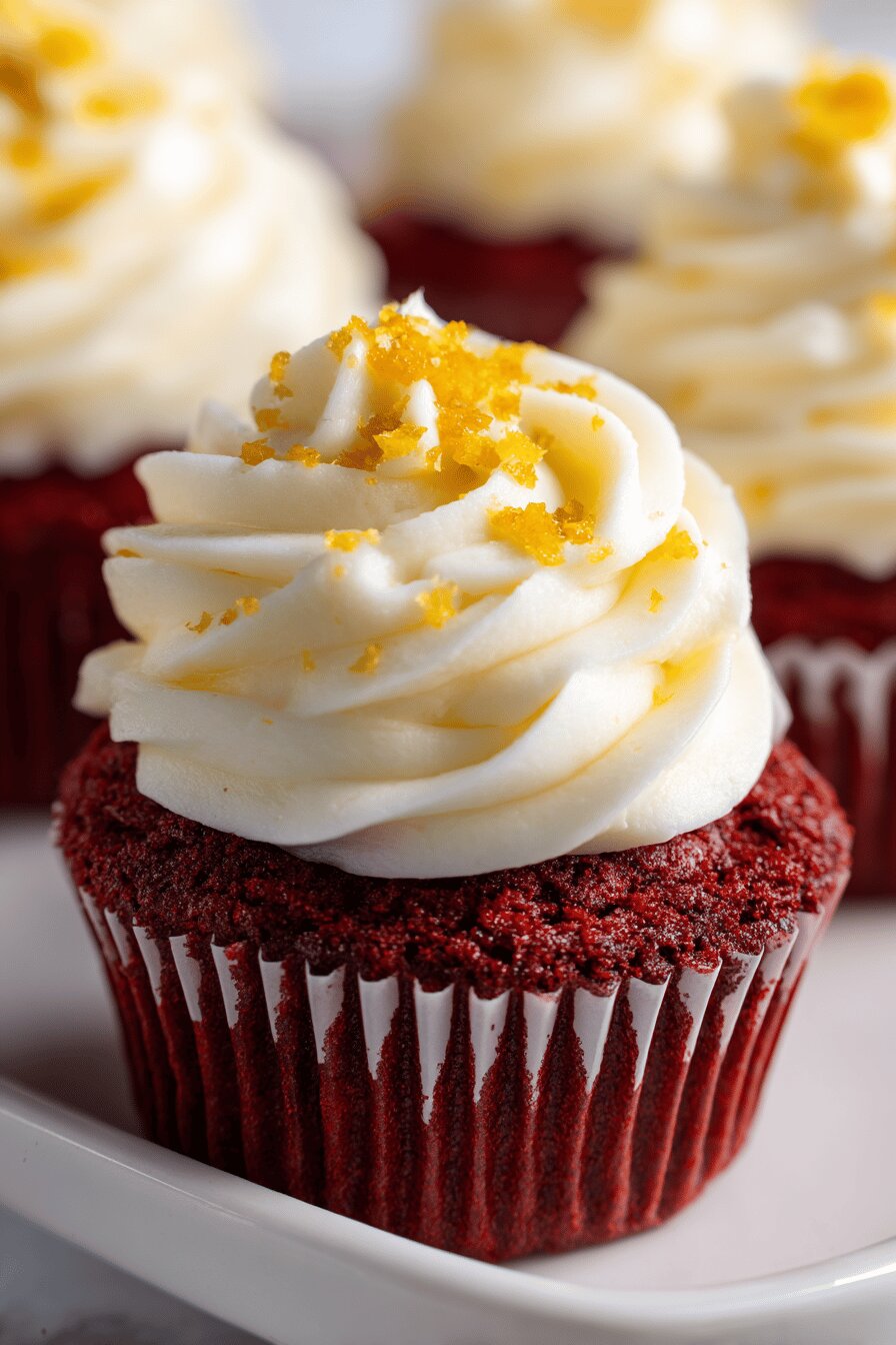 Cupcakes de cor forte, textura macia, com um toque cítrico e cremoso por causa do creme de cream cheese e limão. Receita com quantidades ajustadas e ingredientes trocados para um sabor diferente mas surpreendente. Leve, sem nozes, fácil de fazer em casa e glaceado com um creme que substitui a tradicional meringue, usando creme de cream cheese. Tempo de preparo e cozimento alterados para melhor controle.