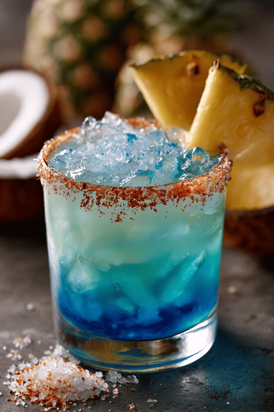 Num clima de festa tropical, esse drinque vai direto ao ponto. Nada de enrolação. Rum dourado em maior quantidade, pra dar corpo, mas suave. Curaçau azul, não muito; cor vibrante, chama atenção, conversa com a do abacaxi. Água de coco na brincadeira, pra dar frescor, textura sutil, surpreende. Limão sicilianoroda na borda, açúcar pra estalar a boca antes do primeiro gole. Gelo só no shaker; copo despido pra não perder força. Folha de hortelã rouba a cena no final, aroma e cor. Fácil, rápido, sabor marcante, verão no copo. A cara das férias.