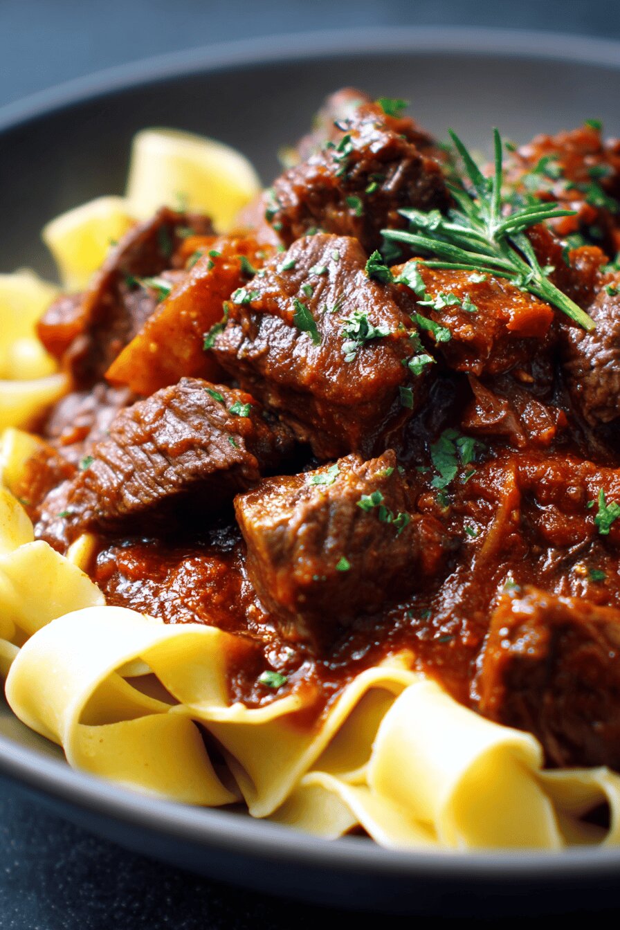 Carne de boi em cubos, cozida lentamente com legumes, vinho e um toque de ervas que lembra uma daube clássica. Substituições inteligentes para ingredientes delicados, equilíbrio entre sabores intensos e texturas macias. Prato robusto, perfeito para esquentar noites frias.