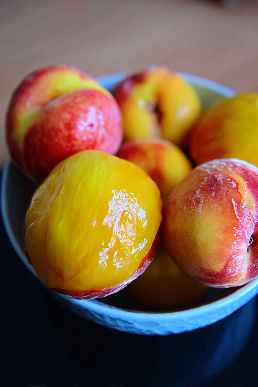 Evite os muito verdes. Difícil a casca sair. Muito maduros ficam moles de mais. Melhor que sejam maduros, mas firmes. Nectarinas são a boa, casca mais fina.