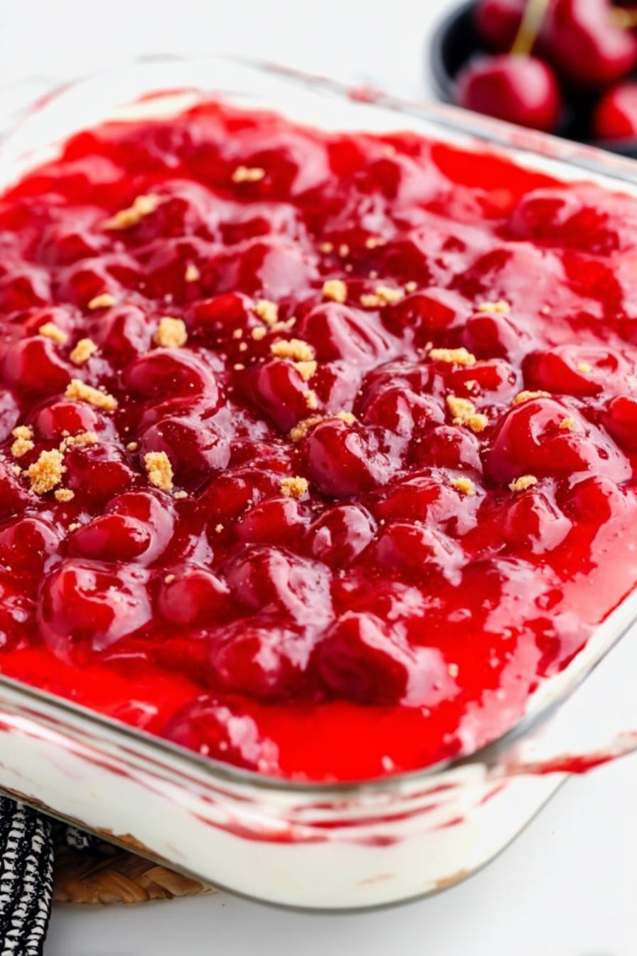 Creme de cream cheese batido com extratos de baunilha e amêndoas, misturado com marshmallow fluff e cobertura chantilly. Finalizado com geleia de cereja em cima, gelado antes de servir com bolachas tipo graham ou biscoitos de sua preferência. Textura leve porém absolutamente cremosa; doce na medida, com toque ácido frutado da cereja contrastando na boca. Rápido e fácil, ótima pedida pra reunião casual, daqueles lanches que somem rápido. Substituições possíveis: creme de leite batido no lugar do chantilly pronto, essência de rum se não tiver amêndoa. Dicas sobre consistência do cream cheese - deve estar macio pra não empelotar, misturar bem até ficar visivelmente lisinho, sem ficar aguado. Sinal que está no ponto? Quando passa de uma textura pesada pra um creme aveludado, quase leve. O topo com cereja cria uma camada visual linda, brilhante, seduz e deixa a tentação crescer.