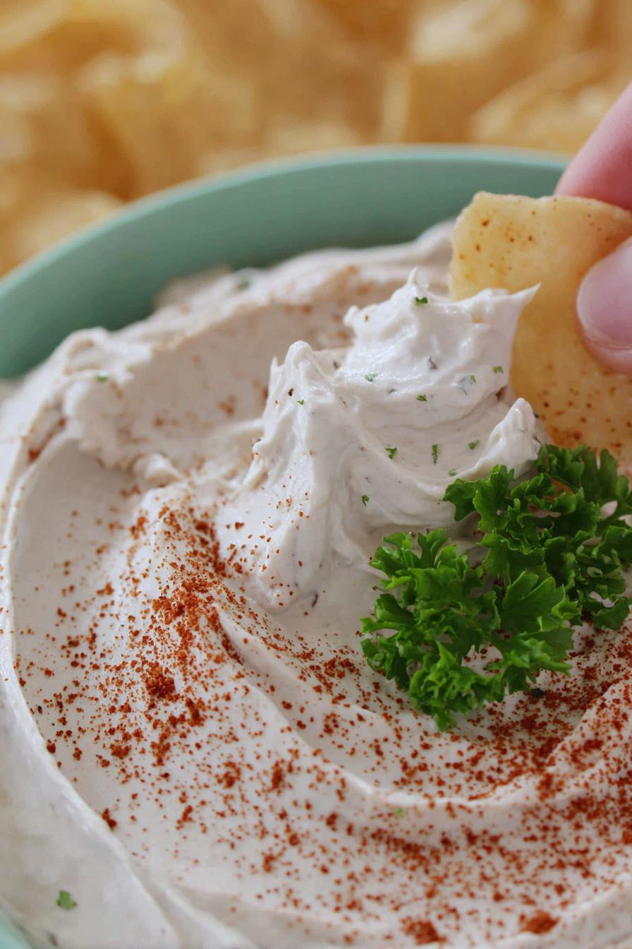 Combina um mix de sopa de cebola com creme azedo e molho inglês, criando um dip com aroma inconfundível e sabor equilibrado. O tempero leve da páprica defumada e o toque fresco da cebolinha dão vida à textura cremosa, perfeita para acompanhar batatas chips crocantes. A receita exige refrigeração para fundir os sabores, e tem variações que substituem ingredientes para se adaptar ao que tem em casa, além de dicas para evitar que o creme azedo talhe.