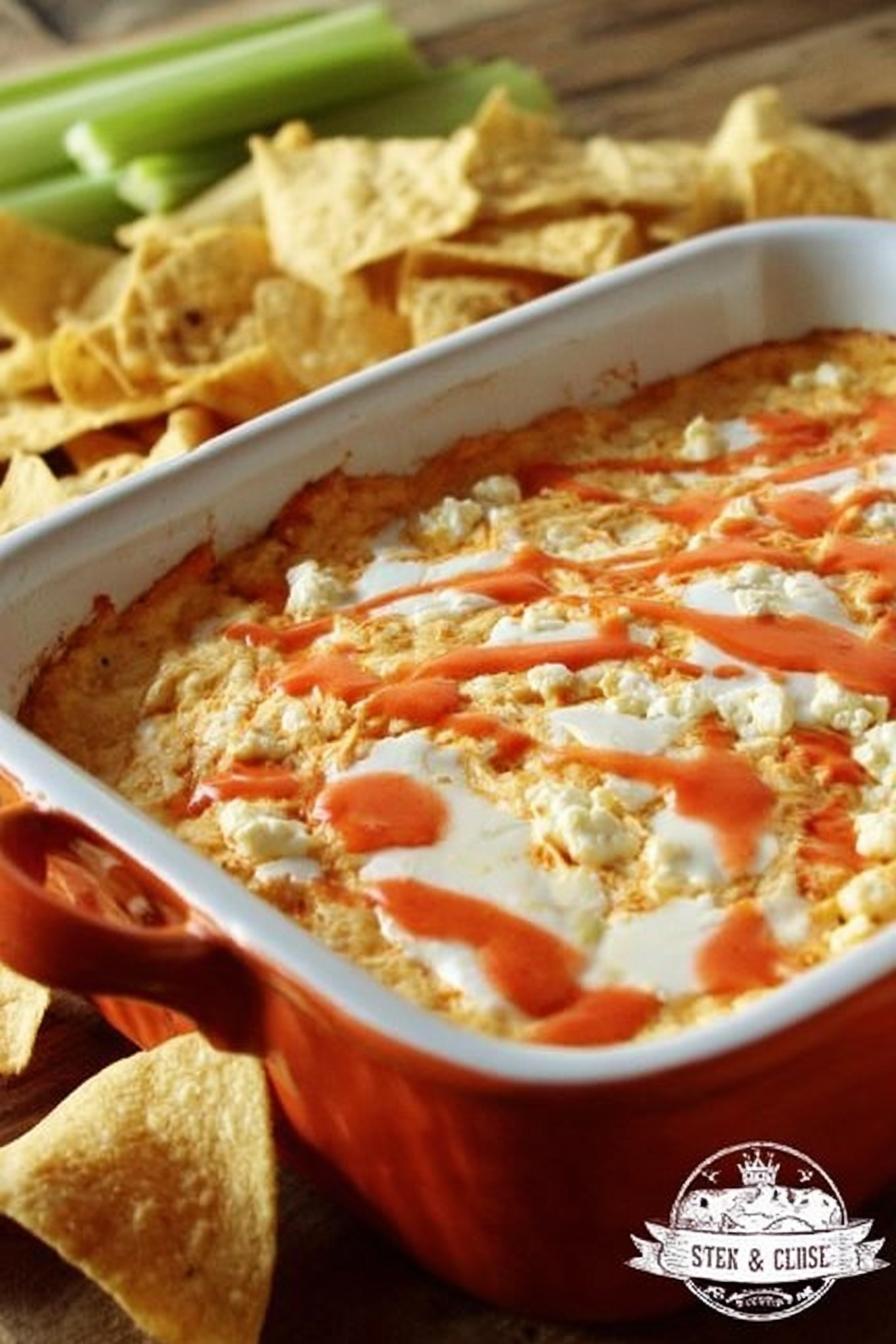 Receita cremosa e apimentada de dip com frango desfiado, cream cheese e molho buffalo. Excelente para petiscos ou aperitivos, servido com talos de aipo, chips de milho, pita ou biscoitos. Usa uma mistura baseada em molho ranch para suavizar o calor da pimenta, e queijo mozzarella para derreter e dar textura. Cozimento feito até borbulhar nas bordas, garantindo que esteja bem quente e saboroso. Ingredientes adaptados para variar um pouco as quantidades, além de substituir parte do queijo por queijo cheddar para um sabor mais pronunciado e textura mais firme. Tempo ajustado para indicar sinais visuais e táteis do ponto de forno.
