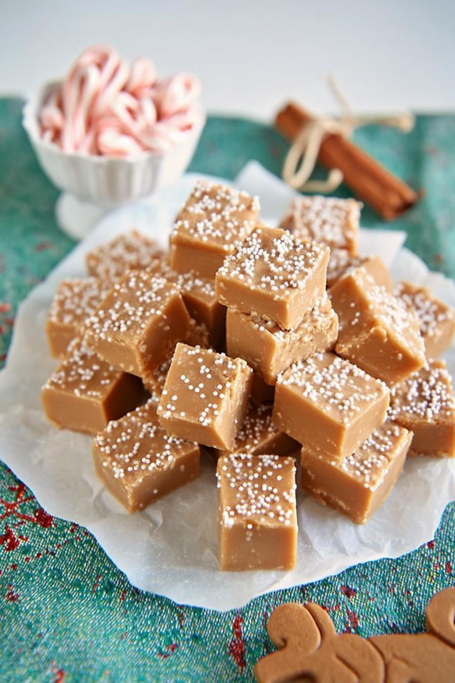 Fudge com toque de especiarias que queimam um pouco na boca. Usa manteiga, creme de leite, melaço e xarope de milho, mas troca canela por cardamomo pra dar um aroma inesperado. Cozinha em temperatura média pra dissolver o açúcar sem cristalizar. Usa termômetro até 118 graus (ponto bala mole). Resfria sem mexer pra dar textura certa. Depois bate rápido com manteiga e baunilha. Espera firmar no papel manteiga antes de cortar em pedaços pequenos. Receita rende bastante e guarda bem na geladeira.