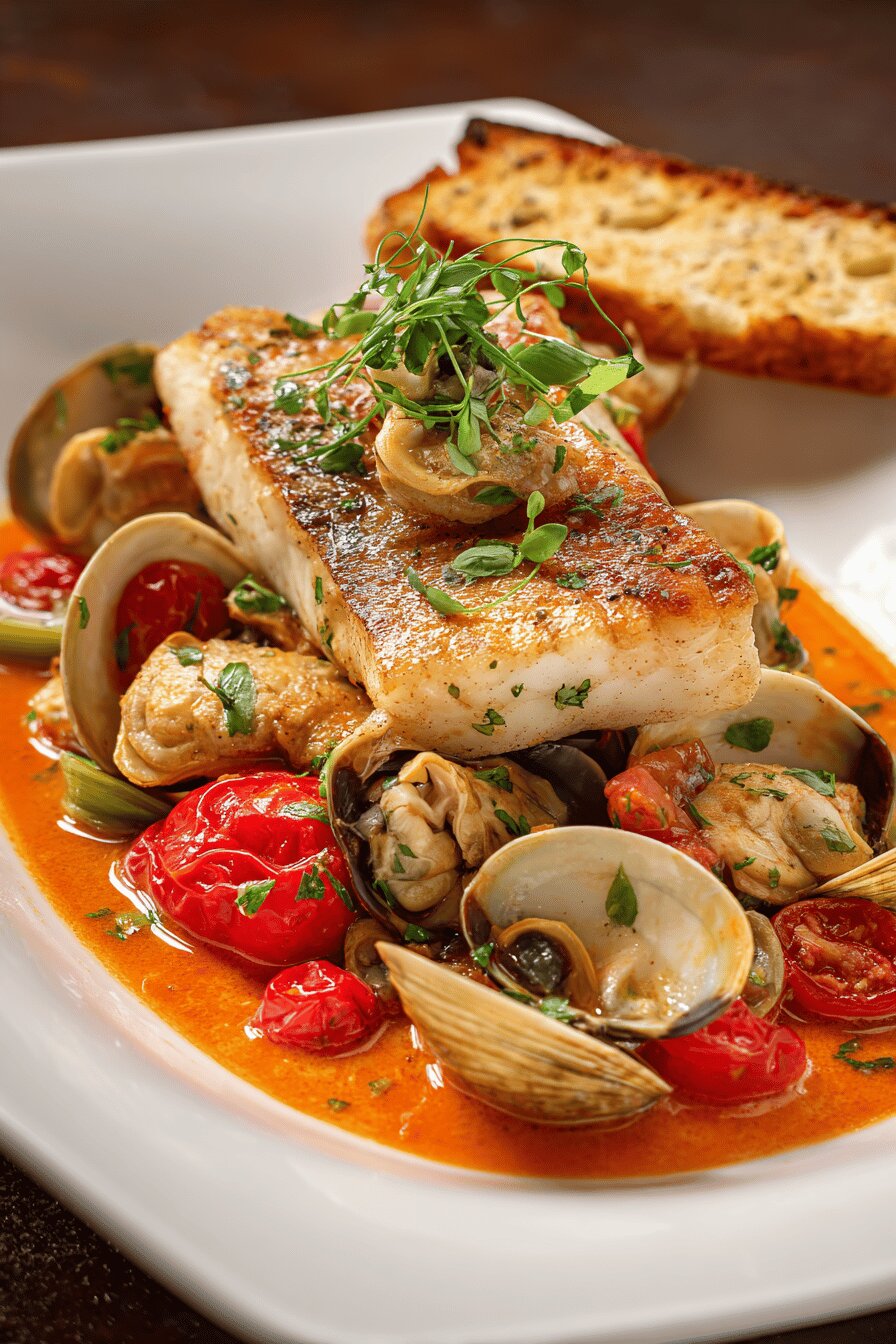 Um prato que atravessa o mediterrâneo direto para a sua mesa, cheio de sabores robustos e aromas que se colam na memória. O peixe amanteigado, o mar que se revela nas palourdas, e o pimentão vibrante transformado em um purê aveludado trazem equilíbrio ao conjunto. Misturei técnicas antigas como o aproveitamento da crosta dos pimentões e o cuidado no fundo da frigideira para um molho untuoso que beija cada ingrediente. Aprendi que tempo demais no fogo resseca o peixe; pouca manteiga, e o molho não emulsiona. Um prato para colocar em jogo seu senso de tato, cheiro e olhar na cozinha. Nem tudo é exato, mas o resultado compensa cada passo improvisado.