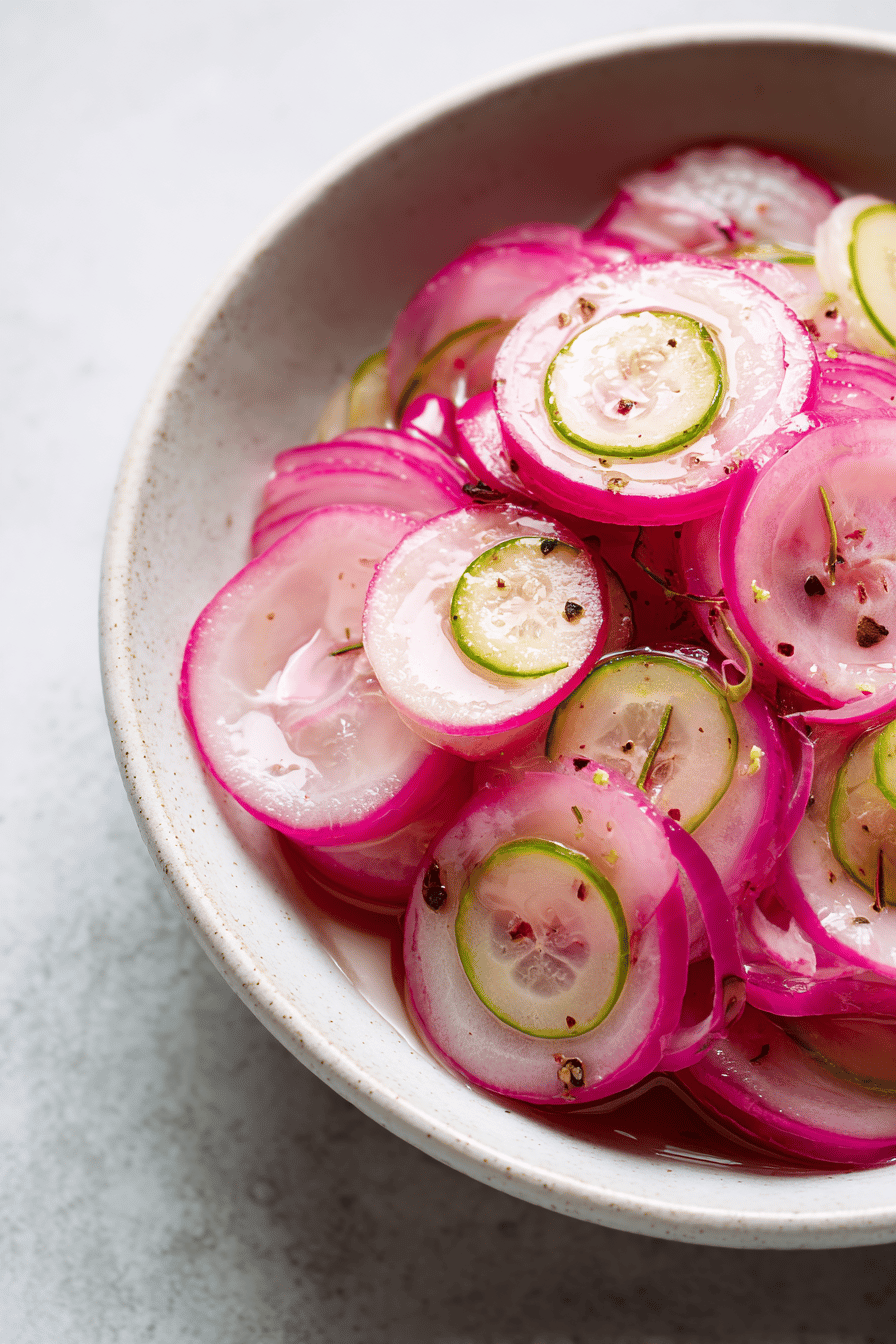 Aqui o segredo está no tempo e na composição do líquido de marinada. Primeiro, misture bem para dissolver mel e sal no vinagre, assim o líquido fica uniforme e mais saboroso. Depois, cortar as échalotes bem finas ajuda no equilibrio dos sabores e faz a textura ficar legal. Colocar as folhas de tomilho junto, mas sem esmagar — só para liberar o aroma. Mexa só para envolver as fatias. A maceração de 25 minutos deixa elas firmes, ainda crocantes, não moles nem duras demais. Sempre escorra antes de usar para não deixar pratos aguados. Sirva gelado pra essa acidez bater de forma refrescante. Dá para preparar até antecipadamente e guardar algumas horas na geladeira, assim o sabor fica ainda melhor.