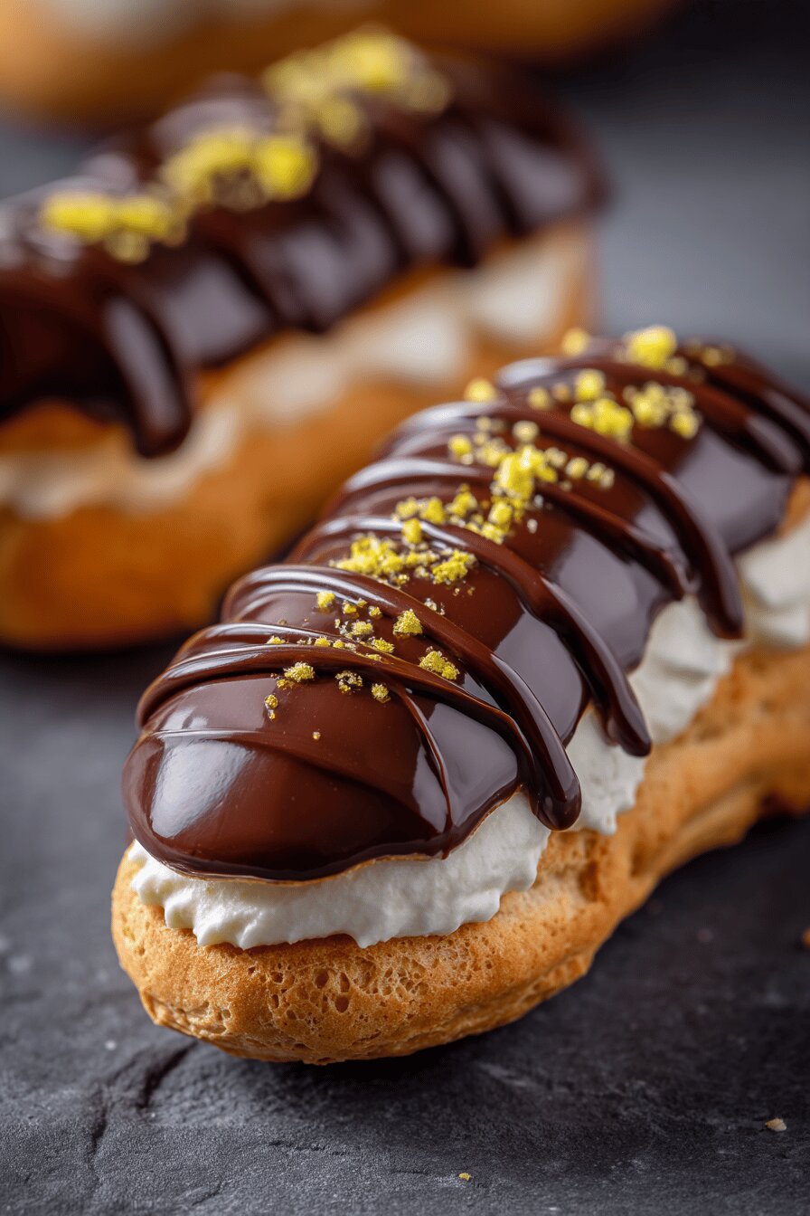 Massa choux com água e manteiga, farinha e ovo, assada até dourar. Recheio tipo creme de confeiteiro com açúcar, farinha, baunilha, leite quente, chocolate branco e substituto do chocolate amargo por chocolate meio amargo para sabor mais suave. Finaliza com chocolate ao leite derretido no topo. Tempo total de preparo e cozimento 1h05m. Serve 8 porções. Receita francesa adaptada para toque brasileiro com pitada de café instantâneo no creme para contraste.