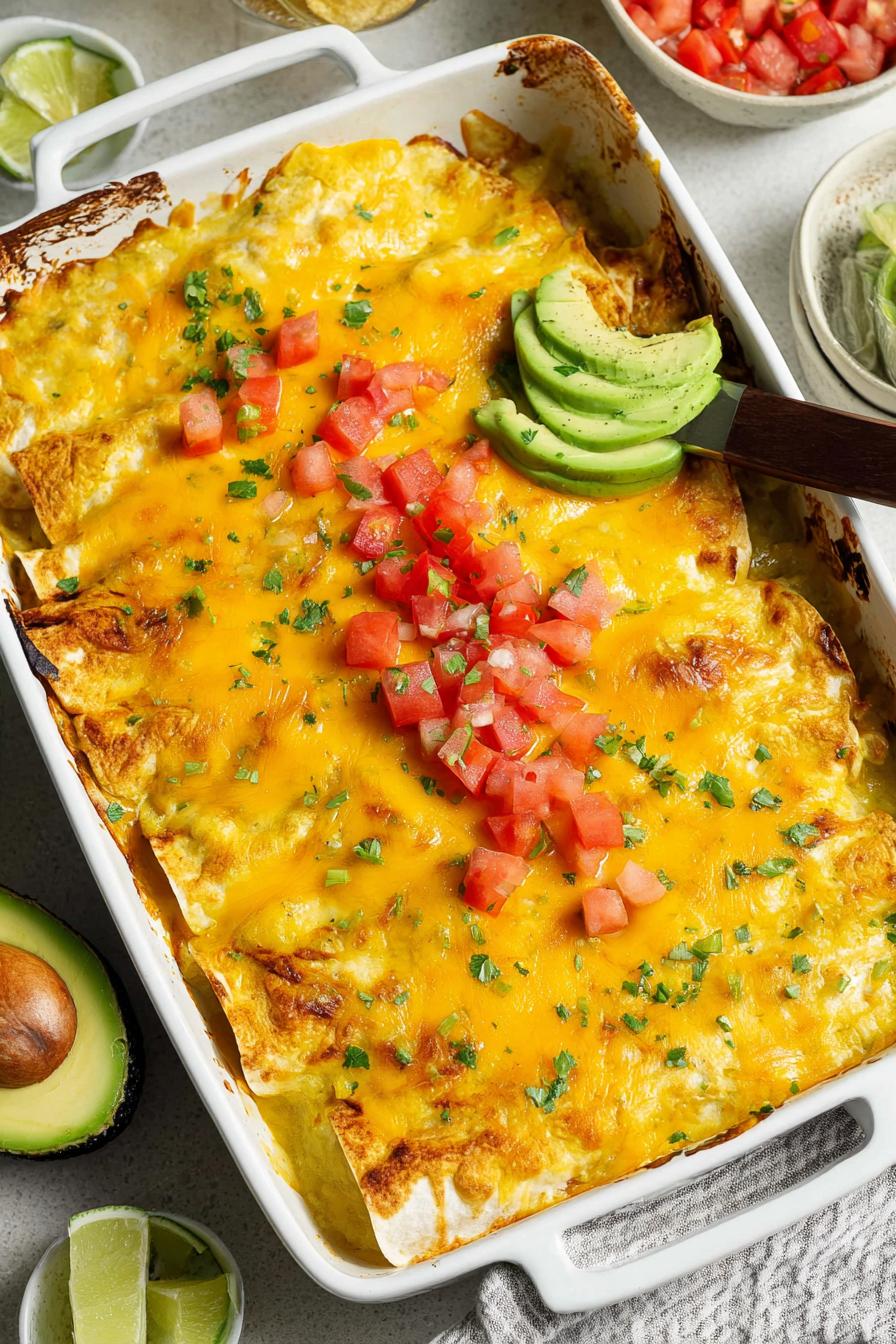 Mistura de ovos mexidos cremosos com linguiça e batatas, enrolados em tortilhas e cobertos com molho enchilada e queijo. Assado até borbulhar, com toque de pimenta e crocância final por cima. Serve para reunião com amigos no café ou domingo preguiçoso.
