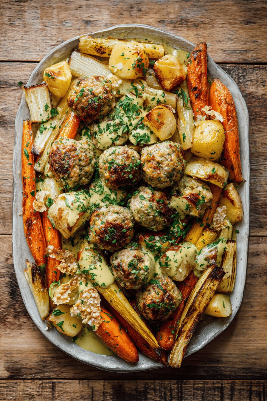 Almôndegas de carne suína magra com vegetais de inverno lentamente assados no forno, servidos com creme azedo de alho. Técnica de assar para manter textura firme, molho encorpado com caldo e farinha torrada. Uso de ervas frescas para aroma e chips de alho para contraste crocante na finalização. Refeição robusta, sazonal, que testa o equilíbrio entre cozimento das carnes e maciez dos legumes, com temperos afinados para não ofuscar o sabor da carne. Substituição do rutabaga por batata-doce para variação regional e toque adocicado. Uma receita que exige atenção aos tempos e observação visual para textura ideal e caramelização dos legumes.