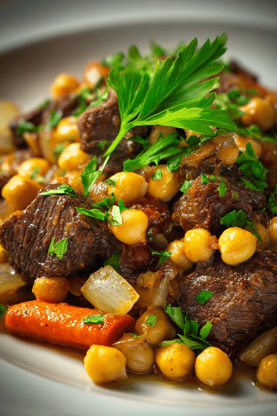 Carne bovina cozida lentamente com grão-de-bico, especiarias e cebola. Receita longa, que pede paciência mas recompensa com textura macia e sabores intensos. Chacoalha a cozinha com aromas de alho e pimenta, enquanto a carne desmancha na boca. Versátil, pode usar patinho ou músculo; substitui pimentão por tomate pra variar, vai do forno à panela de barro. Sem lactose, glúten, ovo e nozes; um acerto pra quem evita esses ingredientes. Ideal pra quem curte comida de raiz, com toque rústico e aquele gostinho de casa, de comida feita com calma.
