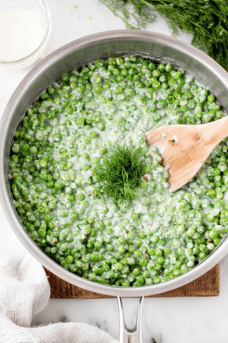 Um prato cremoso de ervilhas congeladas cozidas numa mistura de manteiga levemente tostada e farinha dourada, com um toque de creme de leite substituído por creme fresco para uma textura mais aveludada. Endro fresco acrescenta aroma e sabor, enquanto cebola caramelizada traz profundidade. Cozinhar até o molho engrossar, mexendo sempre para evitar grumos ou queimados. Ideal para acompanhar carnes ou como prato principal leve, é simples e rápido, mas exige atenção ao ponto do creme para não talhar nem ficar muito pastoso.