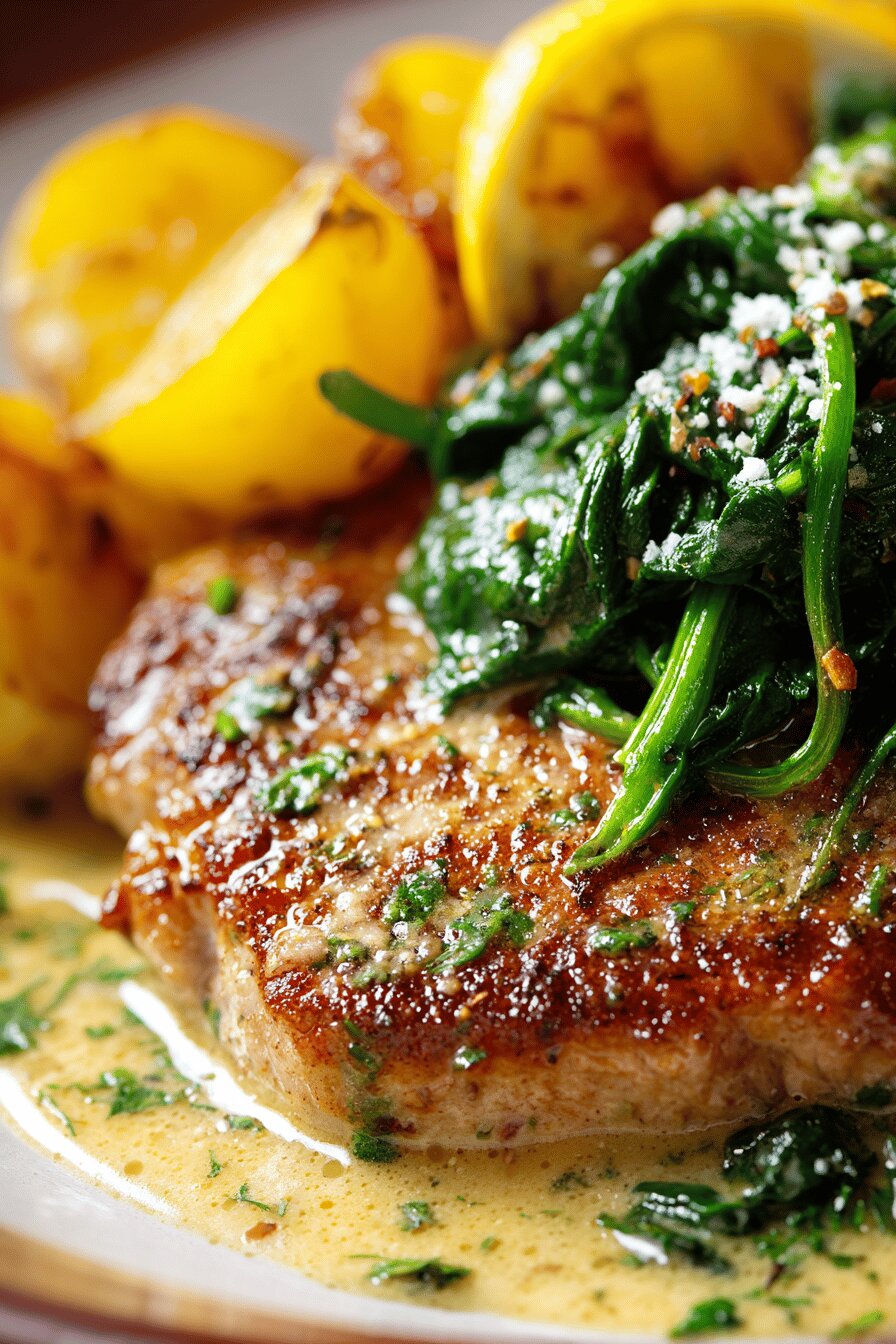 Comece refogando o alho até liberar aroma, fogo médio-baixo para não queimar, manteiga e azeite juntos para equilibrar sabor e ponto da gordura. Espinafre direto na panela, pode parecer muito, mas murcha muito rápido, água evapora em minutos. Junte parmesão só ao final, vem para dar frescor e firmeza na textura. Carne passa pela farinha para selar, frigideira quente, segure próximo a 3 minutos de cada lado, cor dourada sem queimar manteiga. Faça em duas levas para não juntar água na frigideira. Reduza o vinho até metade de volume, isso concentra aroma e açúcar. Tire do fogo para agregar pedaço da manteiga batida, emulsificando molho — isso é regra para molho cremoso sem nata. Finalize com sal e pimenta, mexa rápido. Abóbora corta em cubos e assa com ervas em forno médio, pronta quando dourar e ficar macia, serve para contrabalançar carnes. Serve com tudo quente. Tempo total de 55 minutos, receita prática, sabor intenso. Pode variar vinho, deixar mais ou menos manteiga, adapte ao seu gosto.