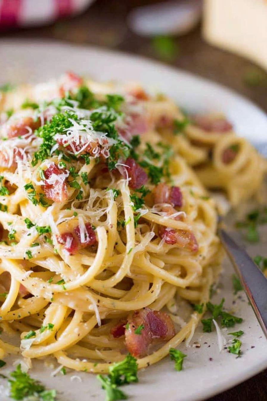 Macarrão cozido e mantido em água quente para não grudar. Molho com ovos, creme de leite, queijo parmesão, alho e temperos que substituem o tradicional. Bacon frito com gordura mantida para sabor extra. Refogado rápido de cebola e cogumelos antes de juntar o macarrão. Mistura delicada do líquido do cozimento com os ovos para evitar ovos mexidos. Cozimento suave para acertar textura do molho. Final com bacon esfarelado por cima. Receita adaptada para intensificar aroma do bacon e dar um toque mais cremoso com creme de leite. Serve 4 pessoas.